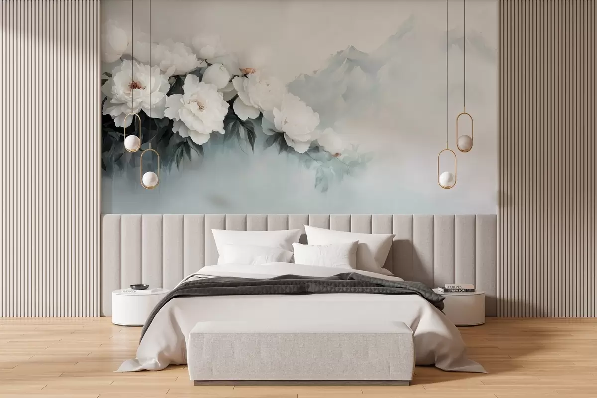 Fototapetai vaizdingi sodrūs balti bijūnai rūko kalnų fone Nr. w03965