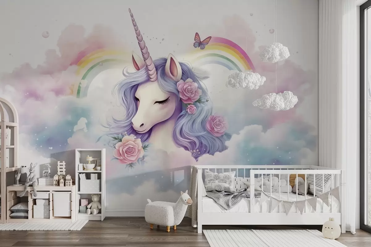 Fototapetai Pastelinis vienaragis debesyse su vaivorykšte ir rožėmis Nr. w03990