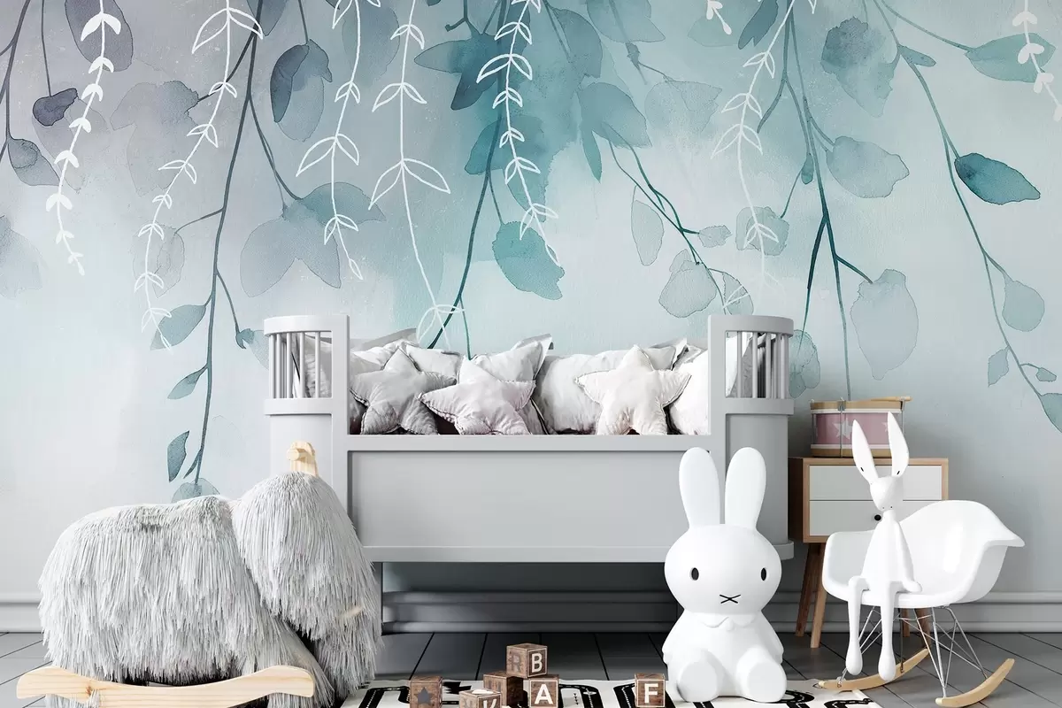 Fototapetai Akvarelės stiliaus šakos su lapais, natūralios akvamarino spalvos Nr. w04007v3