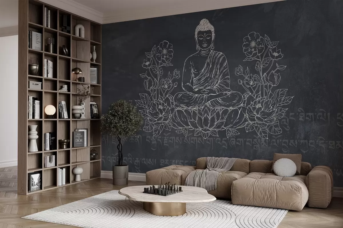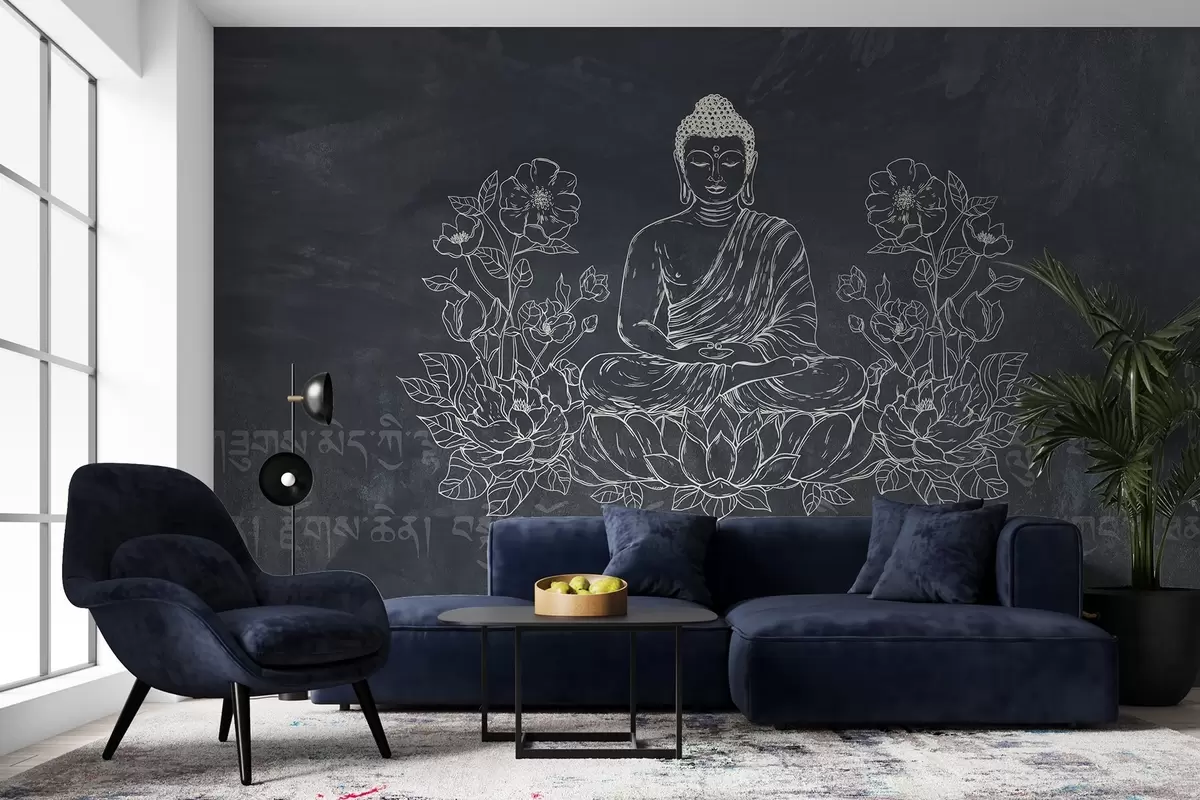 Fototapetai Medituojantis Buda su lotoso gėlėmis, linijų menas, rytietiškas, tamsus fonas Nr. w04008