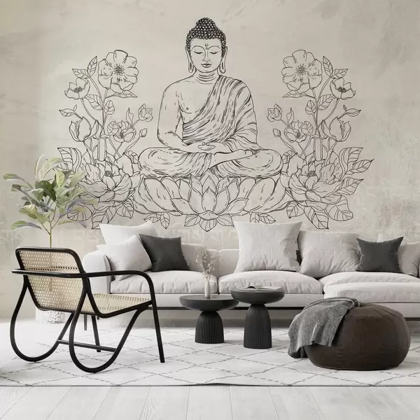 Fototapetai Medituojantis Buda su lotoso gėlėmis, linijų menas, rytietiškas, smėlio spalvos fonas Nr. w04008v1