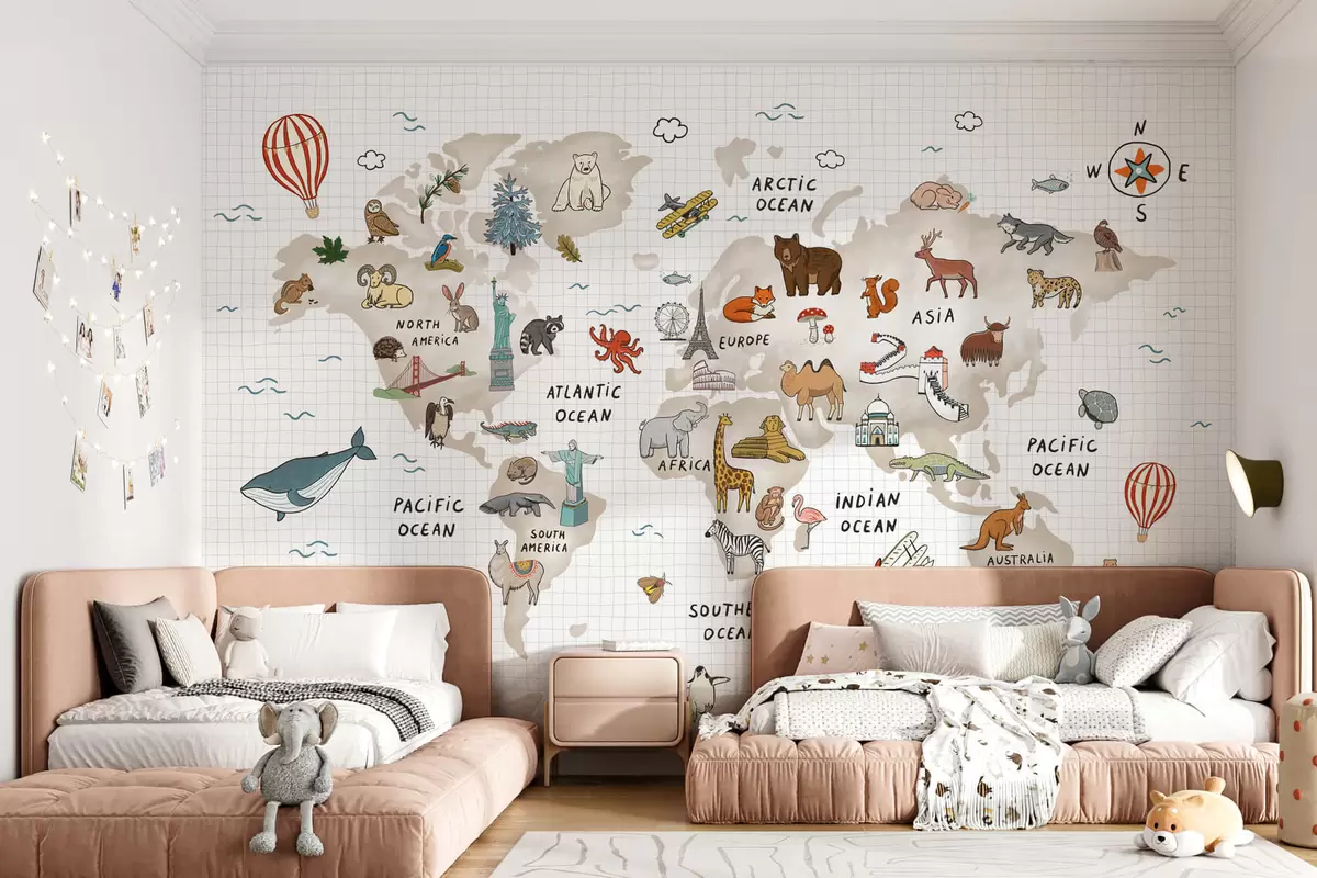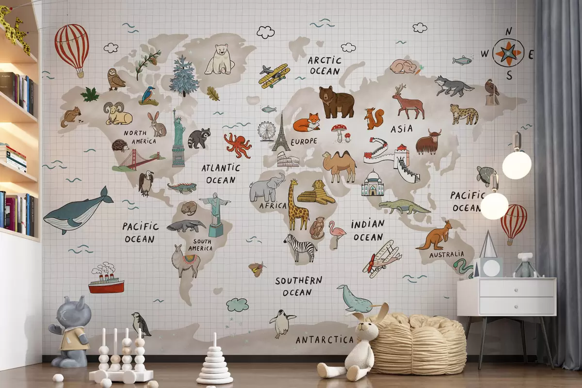 Fototapetai Pasaulio žemėlapis su gyvūnais ir orientyrais Nr. w04011