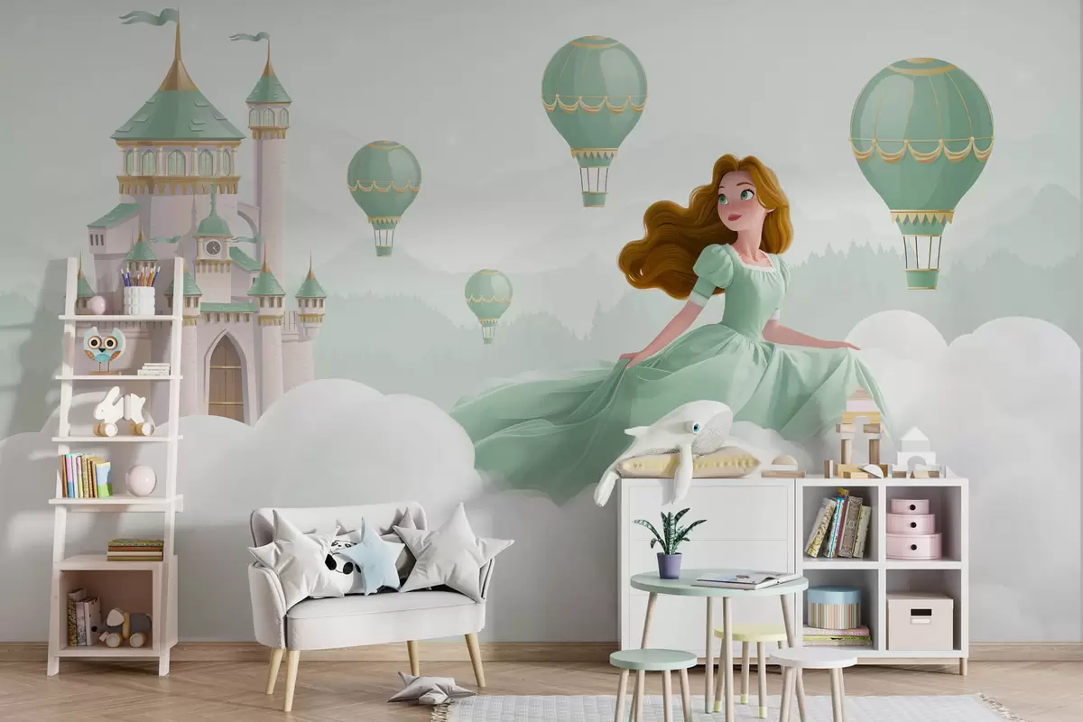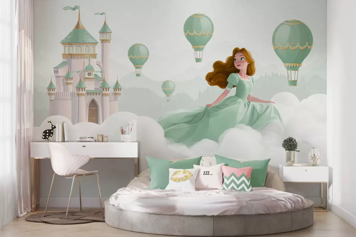 Fototapetai Princesė tarp debesų kraštovaizdžio su pilimi fone Nr. w04015v2