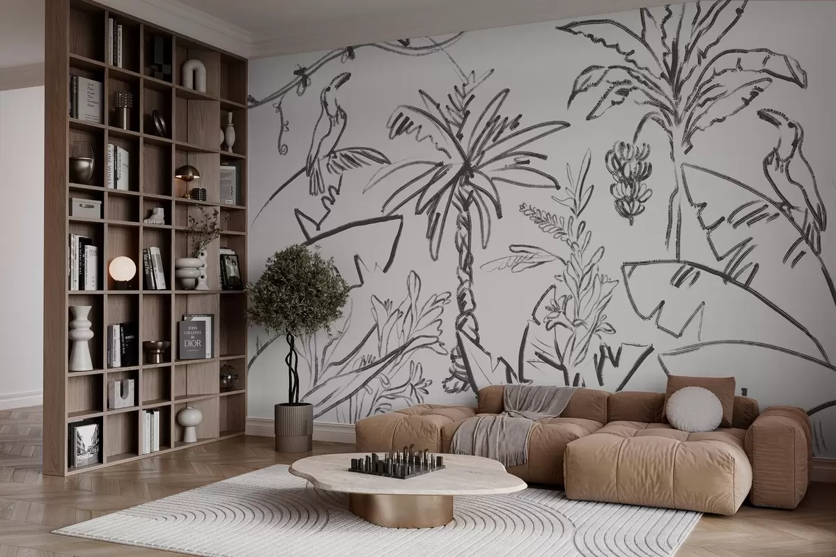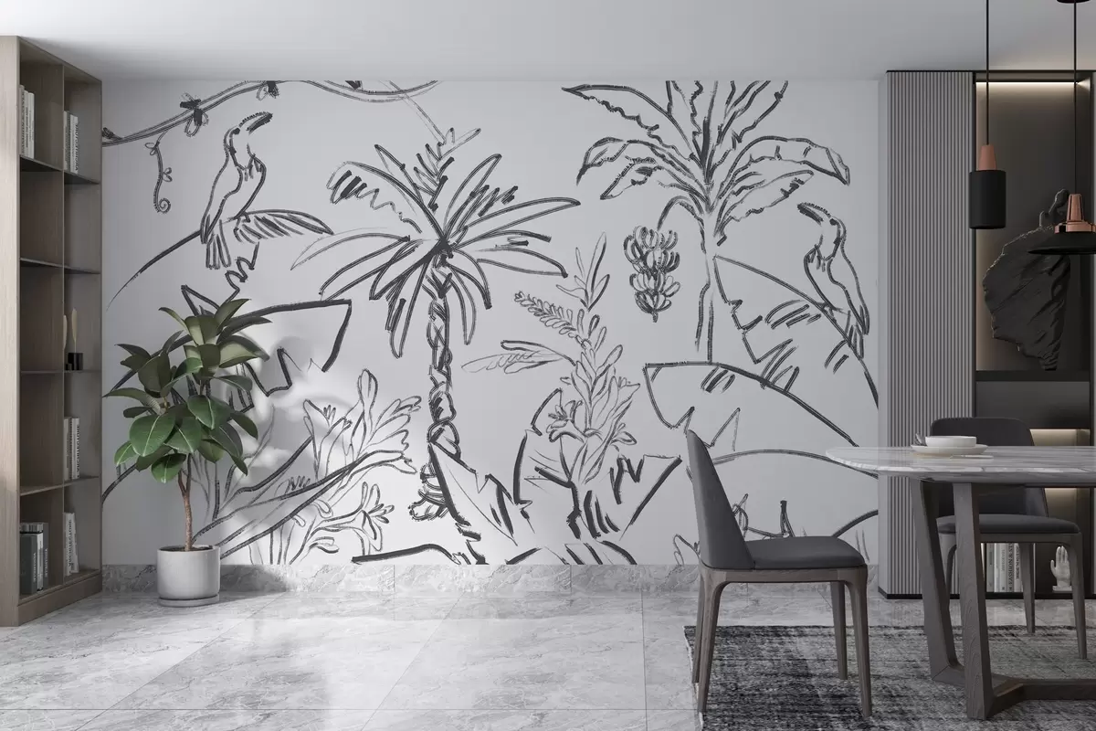 Fototapetai Atogrąžų linijos piešinys, bananai, palmės, kontūrinė grafika Nr. w04020