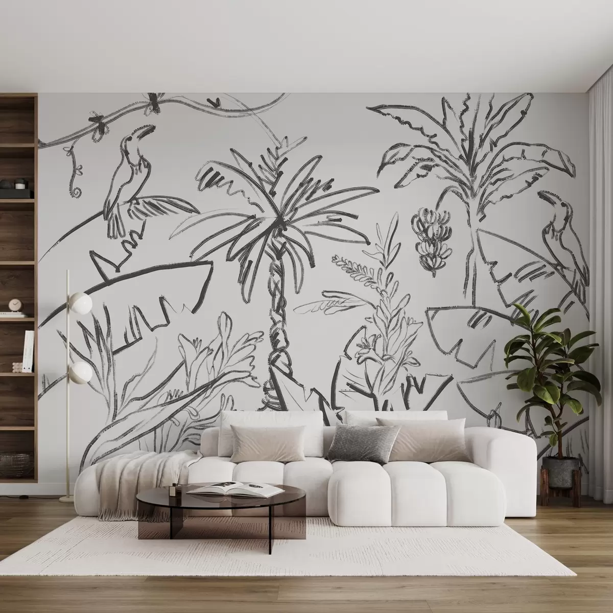 Fototapetai Atogrąžų linijos piešinys, bananai, palmės, kontūrinė grafika Nr. w04020