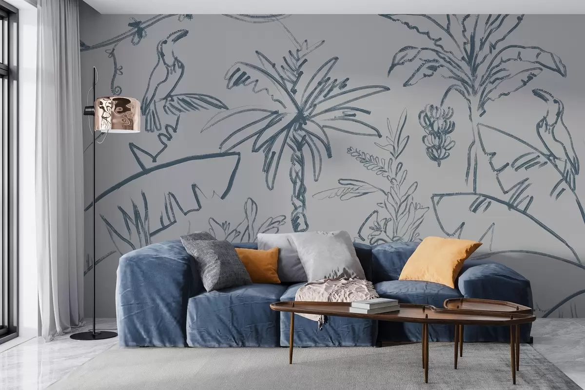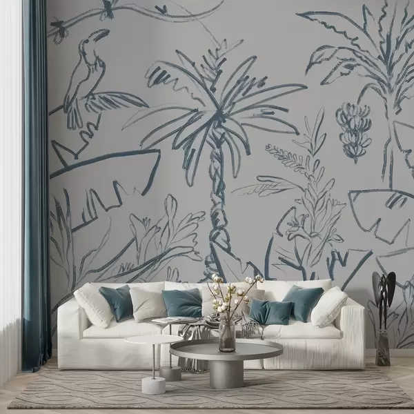 Fototapetai Mėlynos spalvos atogrąžų raštas, bananai, palmės Nr. w04020v1