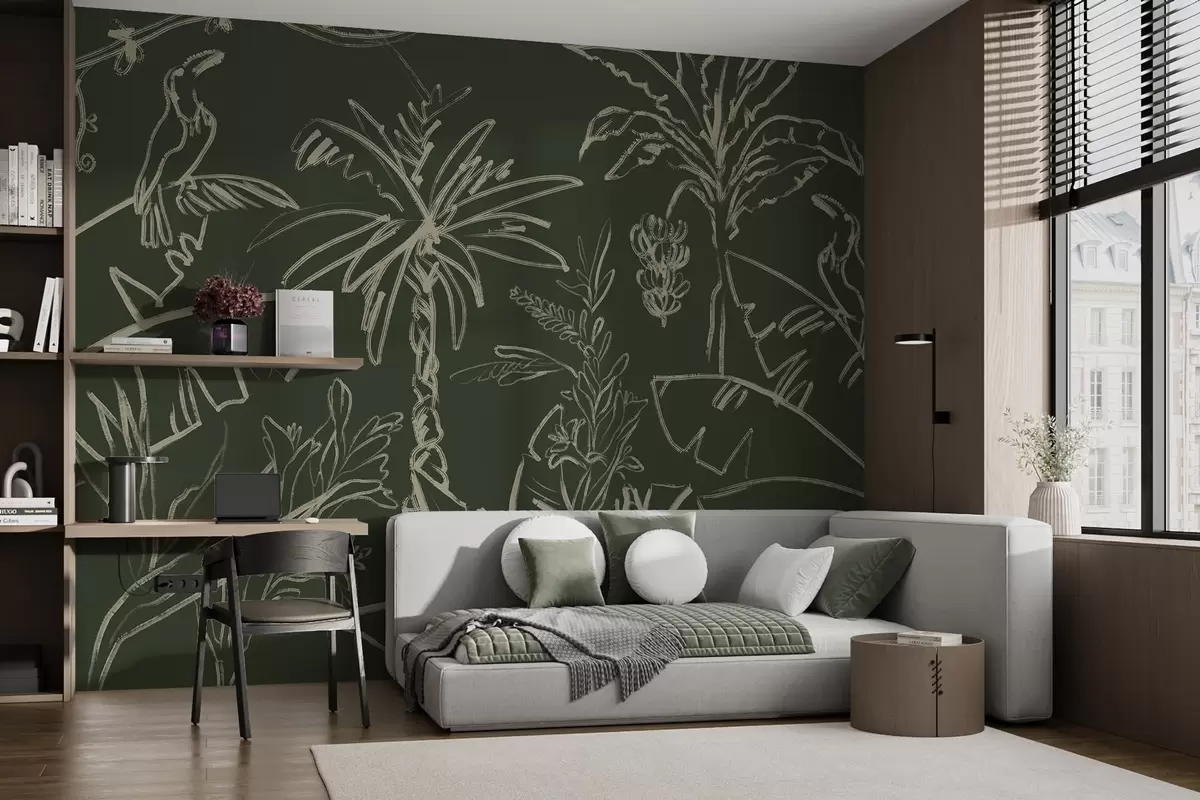 Fototapetai Atogrąžų modelis tamsiai žaliame fone, palmės, bananai Nr. w04020v5