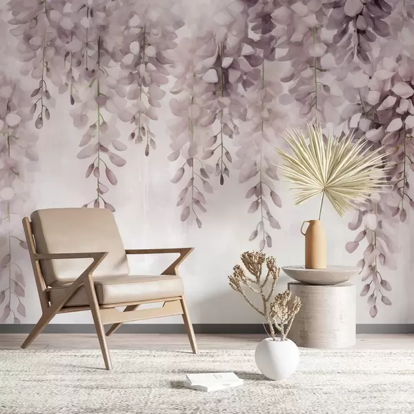 Fototapetai Minkšta kreminės rožinės spalvos akvarelės scena su kaskadomis krintančiomis visterijų kekėmis, sudarančiomis svajingą gėlių užuolaidą Nr. w04034v2