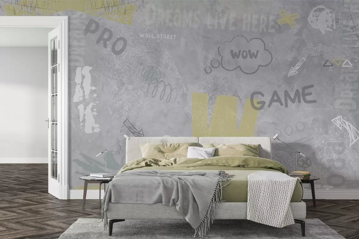 Fototapetai Gatvės meno stiliaus dizainas su geltonos spalvos užrašais betoninės sienos fone Nr. w04056