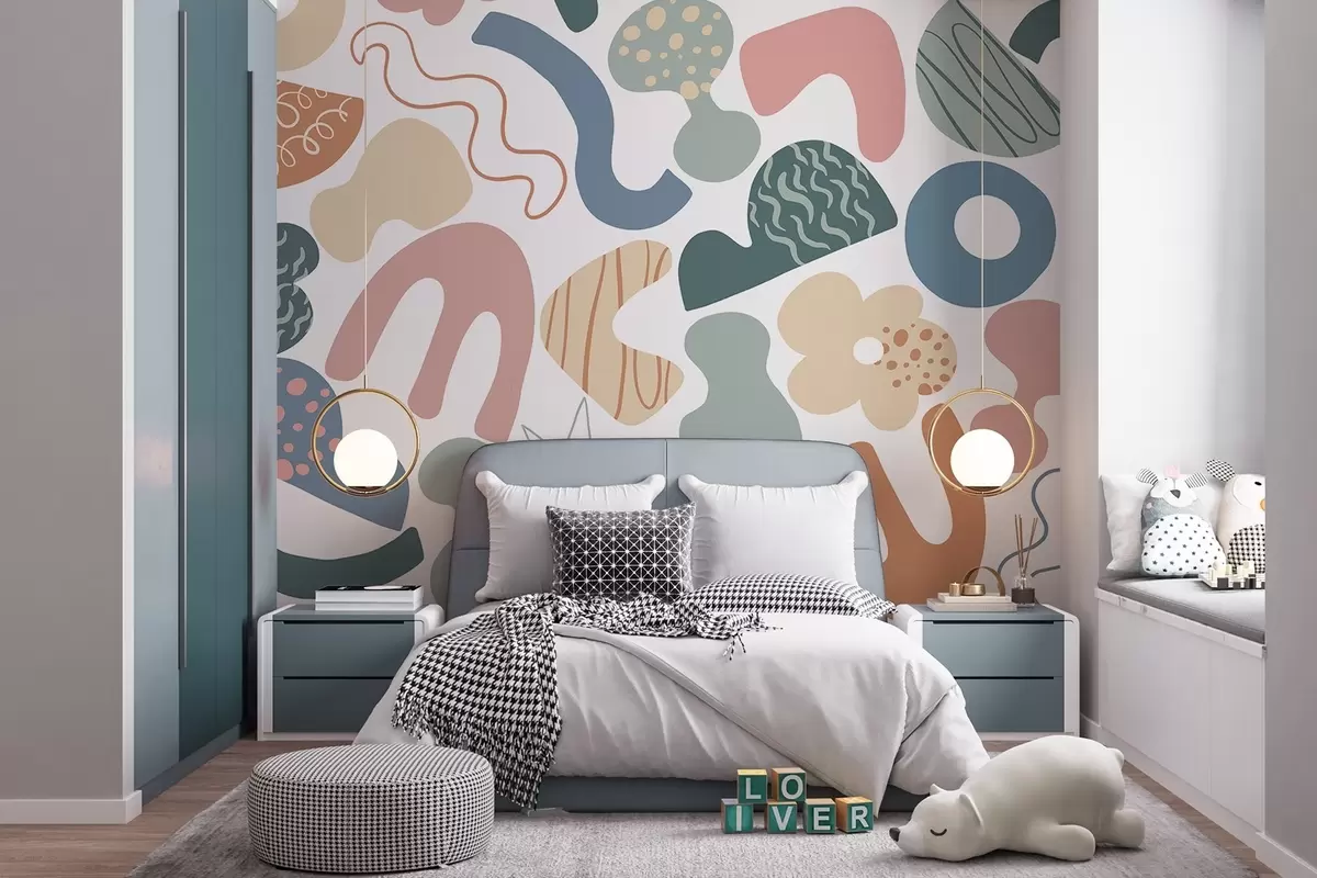 Fototapetai Geometrinės figūros su piešiniu, nepilnamečių, žalia, rožinė, mėlyna Nr. w04068v2