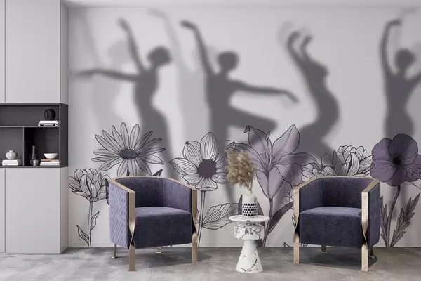 Fototapetai Balerinų siluetai, kaimiškos gėlės, linijų menas, pilkos ir violetinės spalvos Nr. w04069v2