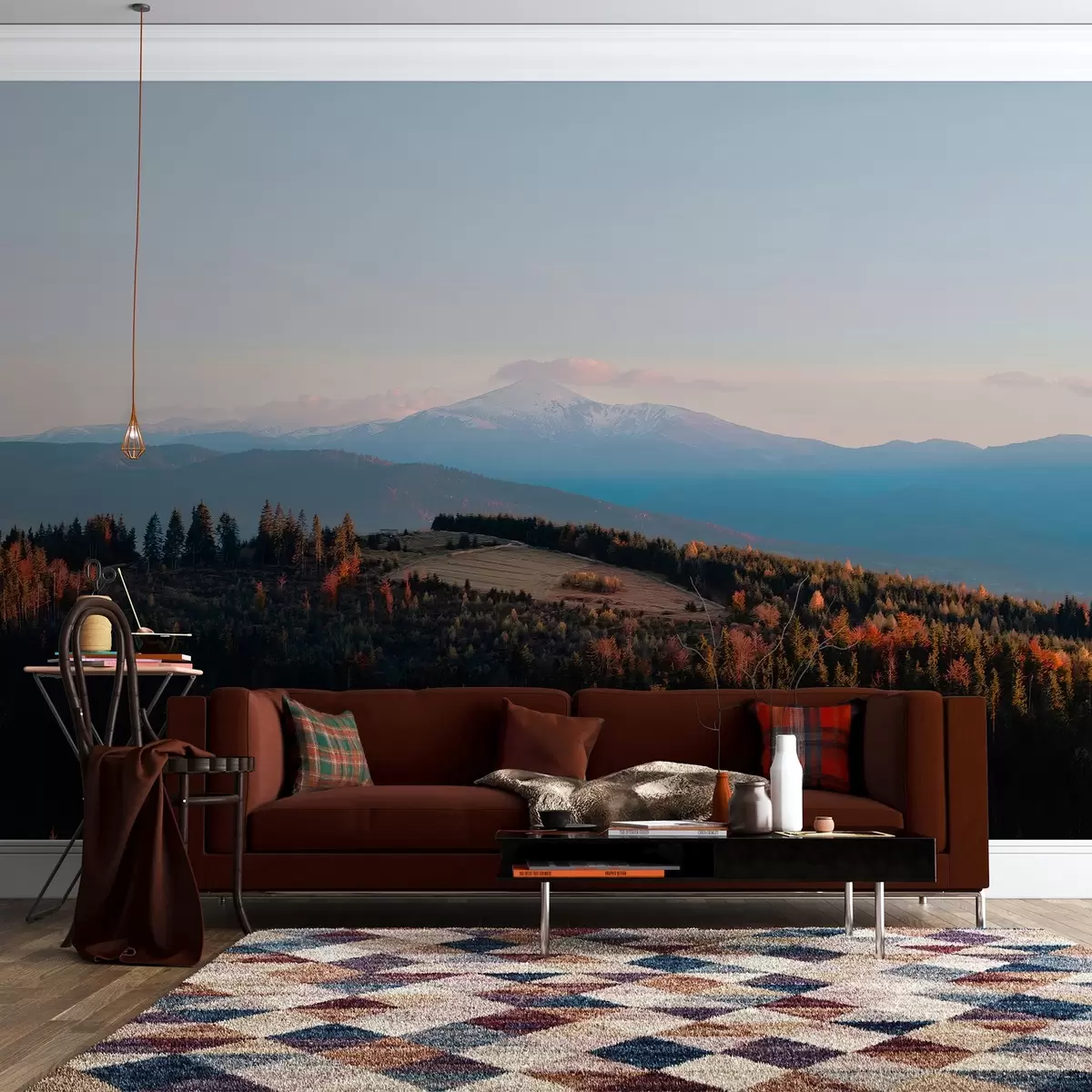Fototapetai Karpatų kalnai, aliejaus stiliaus tekstūra, rudens miškas, saulėlydžio dangus Nr. w04098
