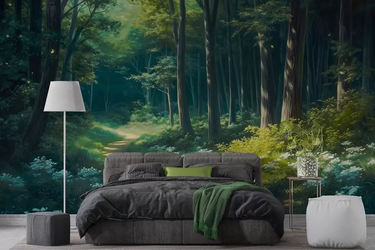 Fototapetai Žalias miškas su švelniais saulės spinduliais, medžiais ir baltomis gėlėmis, piešinys aliejiniais dažais Nr. w04118