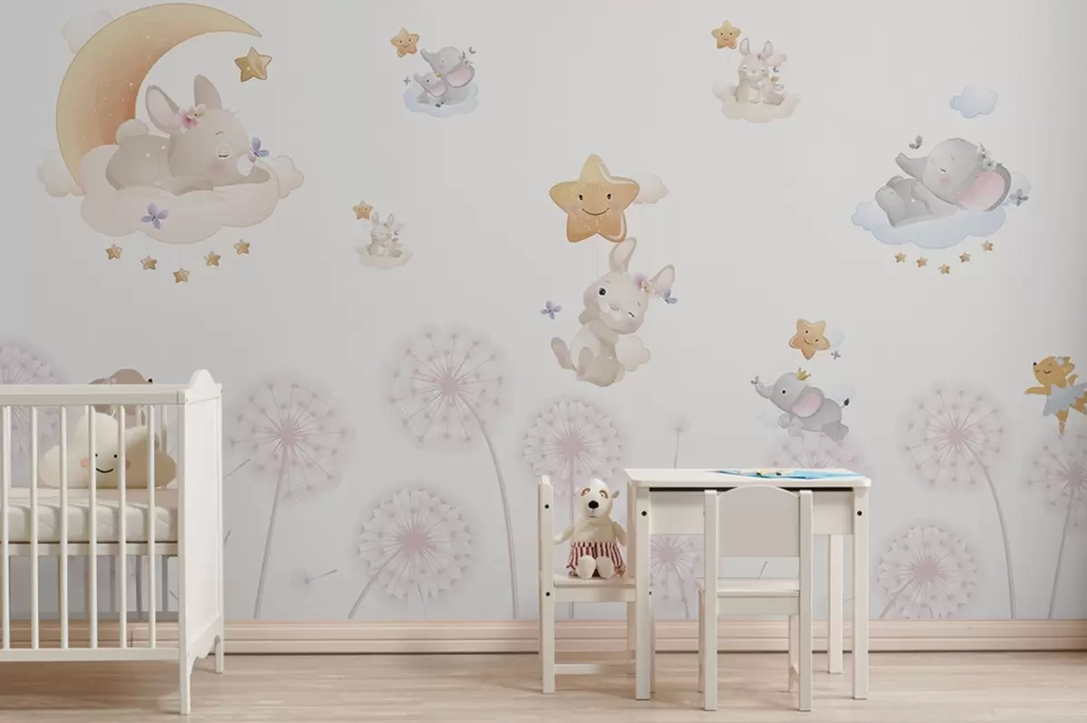 Fototapetai Mielas triušis ir žvaigždės tarp pienių baltame fone Nr. w04195