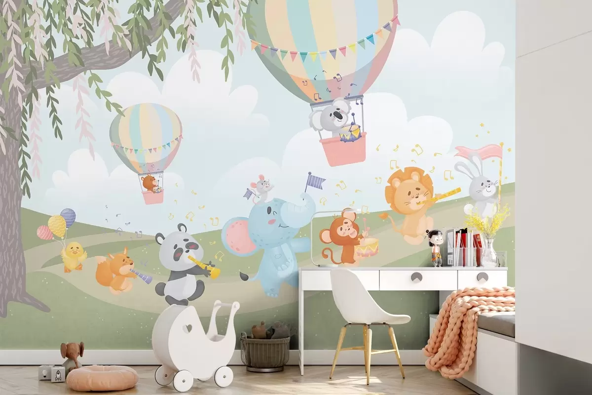 Fototapetai Peizažas su muzikos instrumentais grojančiais gyvūnais Nr. w04200