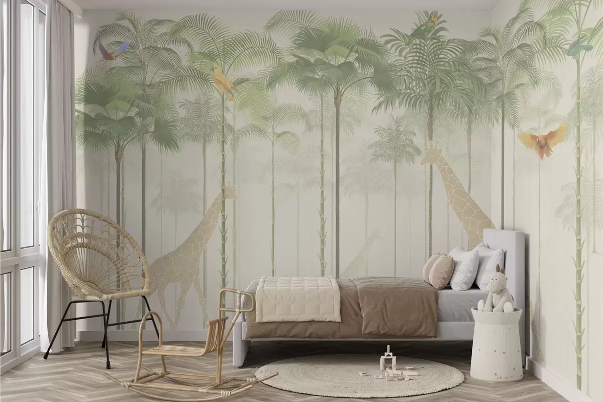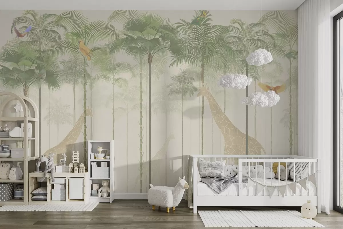 Fototapetai Žirafos ir atogrąžų paukščiai tarp aukštų palmių Nr. w04400