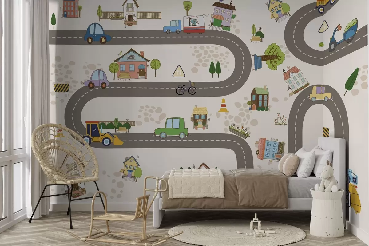 Fototapetai Vaikų kelias su automobiliais ir spalvotais namais Nr. w04404