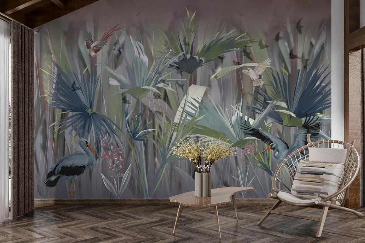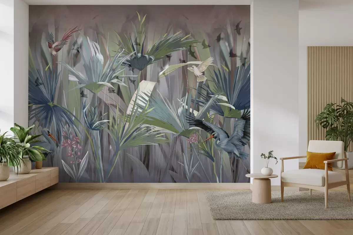 Fototapetai Egzotiški paukščiai tarp palmių lapų ir gėlių Nr. w04458