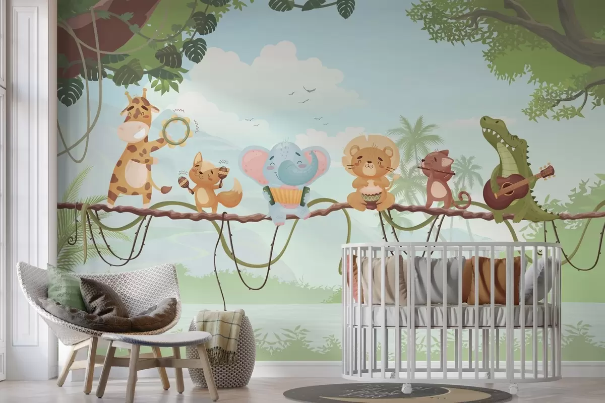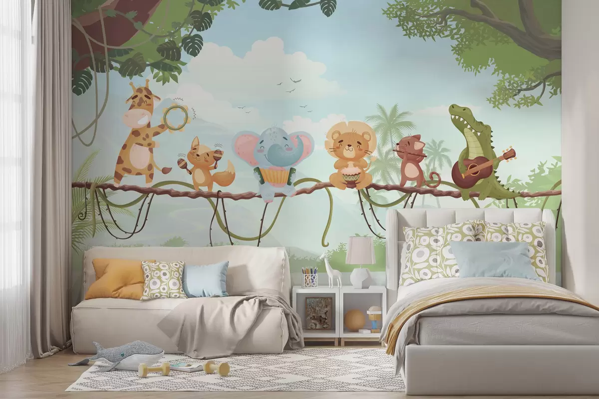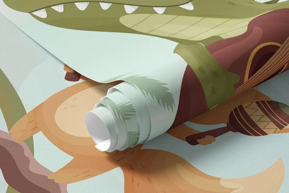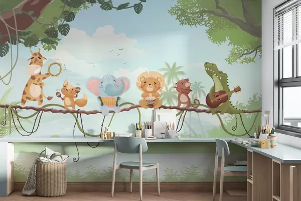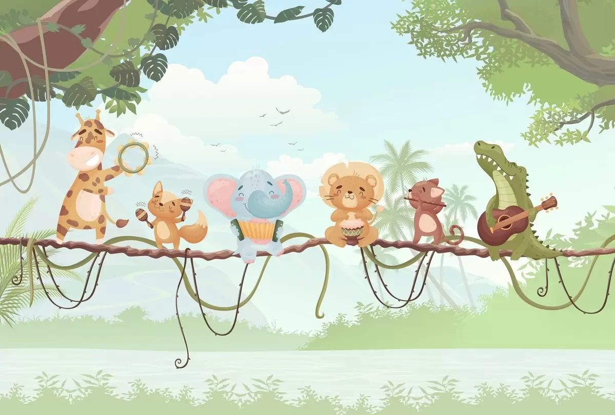 Fototapetai Gyvūnai su muzikos instrumentais tropinio kraštovaizdžio fone Nr. w04505