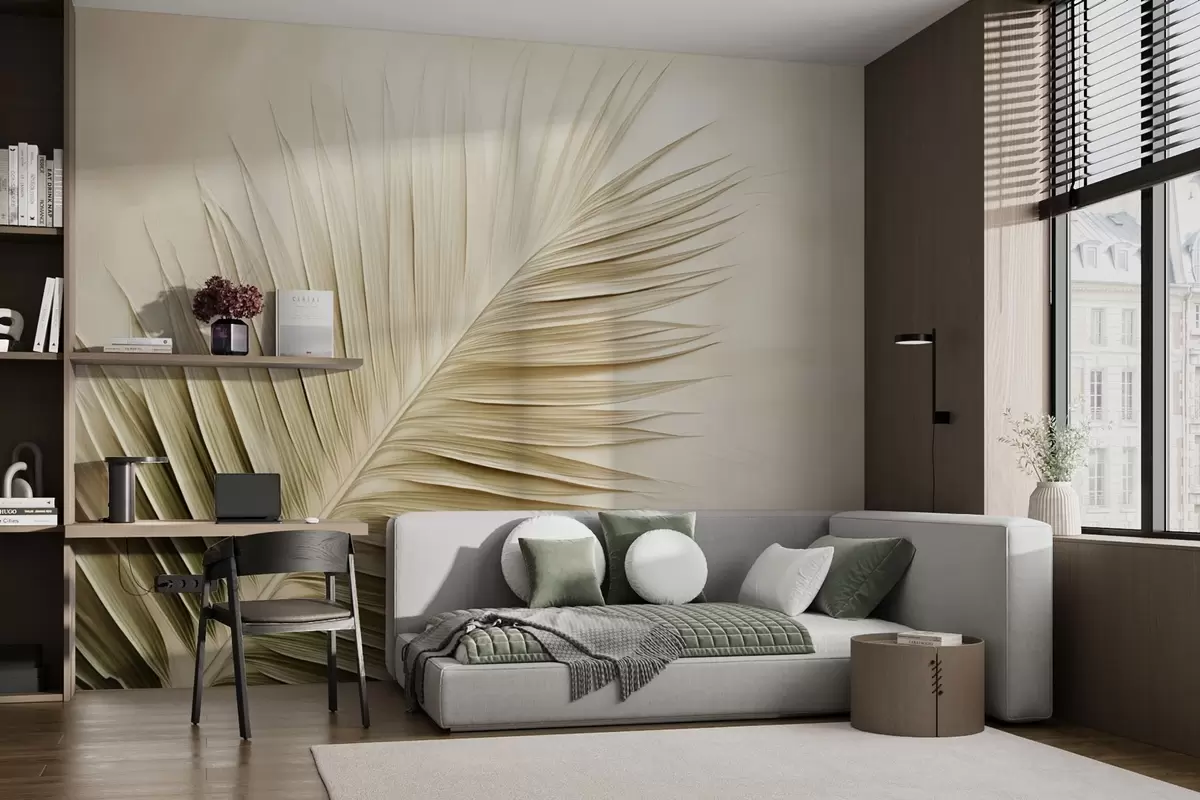 Fototapetai Bėžinė palmių lapų šakutė ant minkšto tekstūrinio fono Nr. w04618