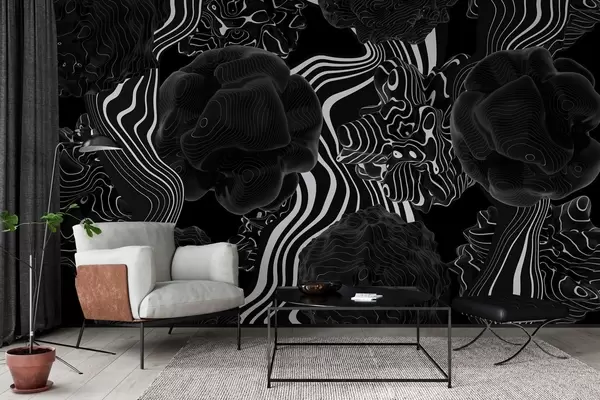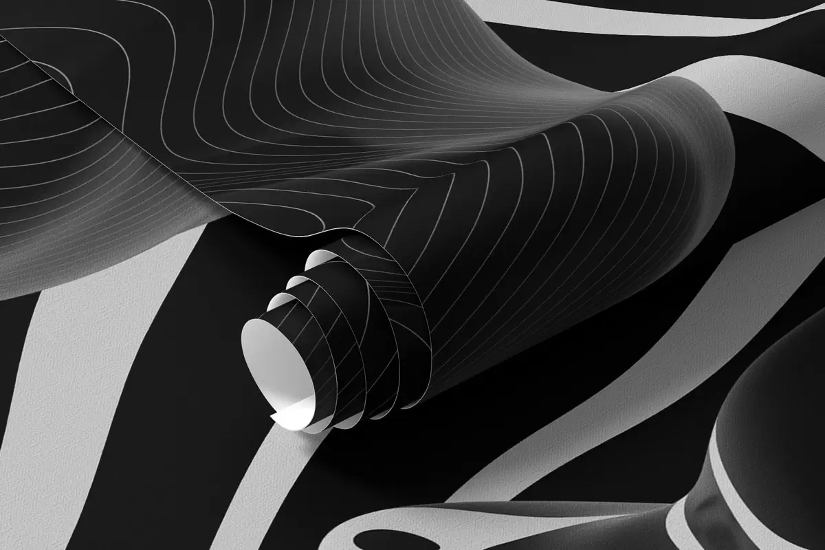 Fototapetai abstrakčios organinės formos 3D stiliumi juodos spalvos tonais su baltomis juostelėmis Nr. w04628