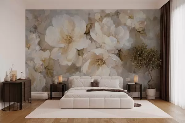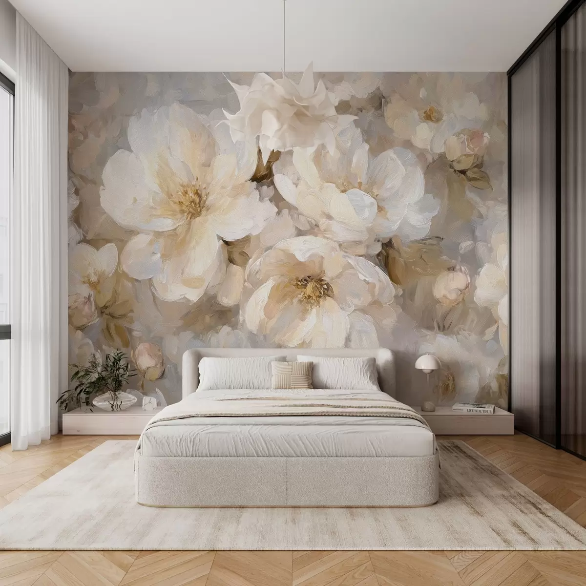Fototapetai dideli balti ir smėlio spalvos žiedai, tapybos stiliaus Nr. w04633