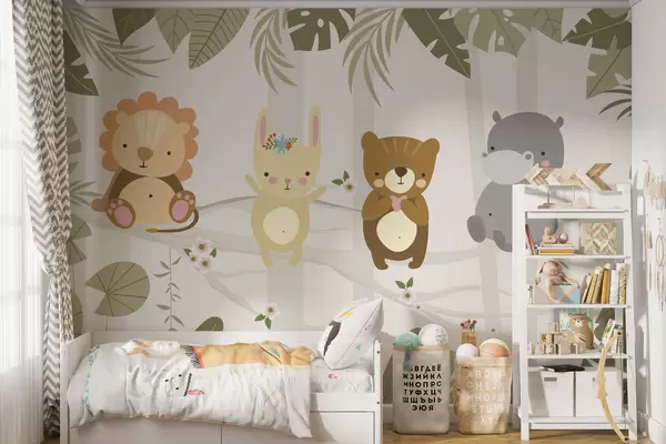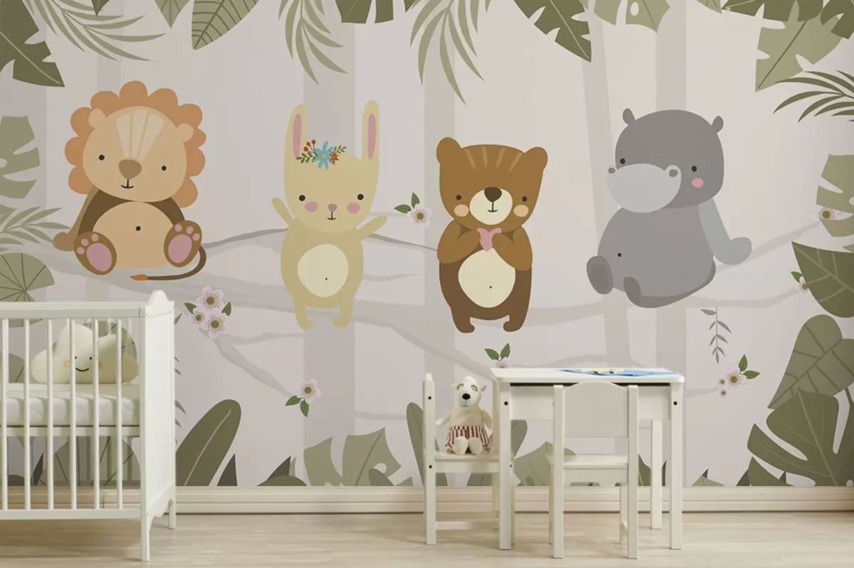 Fototapetai Mielas liūtas, zuikis, lokys ir begemotas tarp lapų Nr. w04682