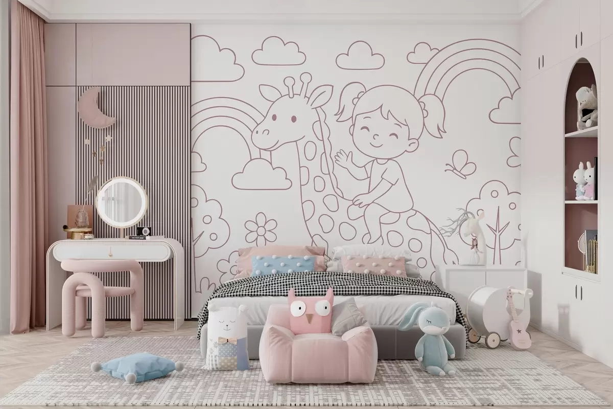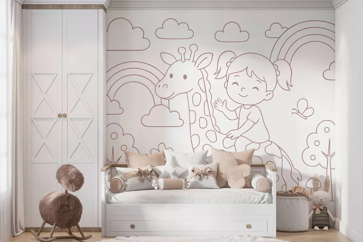 Fototapetai mergaitės ant žirafos piešinys milteliais, vaikiškos spalvinimo knygelės stiliumi Nr. w04753v1