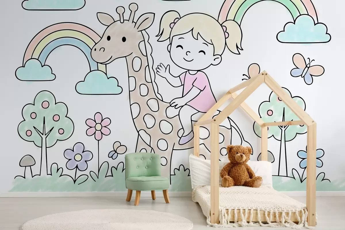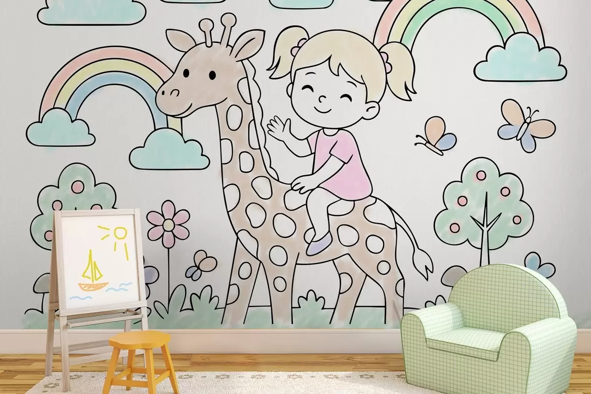 Fototapetai mergaitė ant žirafos, vaikiškos spalvinimo knygelės stiliumi Nr. w04755
