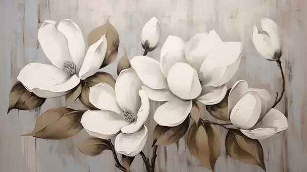 Fototapetai Didelės magnolijos žiedai su rusvos spalvos lapais ant šepečiuoto fono Nr. w04785
