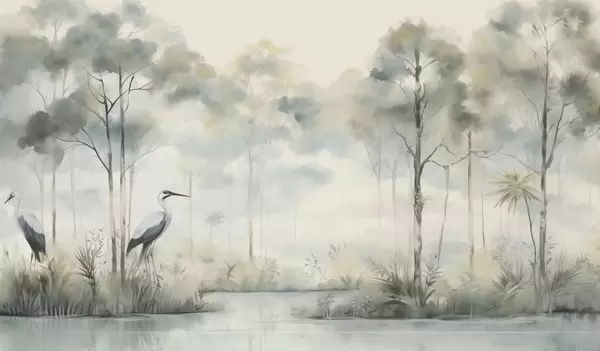 Fototapetai Rūko apgaubtas miškas prie vandens su garniais, švelni šilta spalvų paletė Nr. w04788