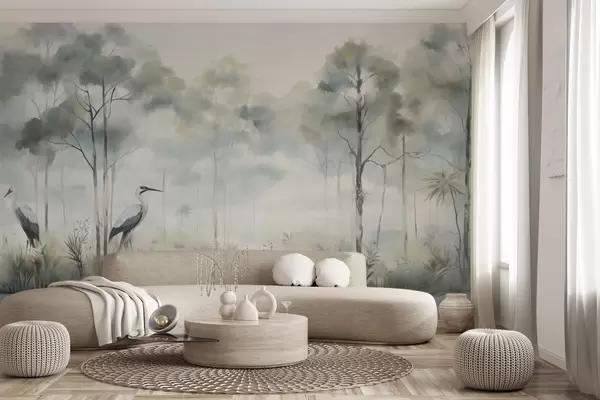 Fototapetai Rūko apgaubtas miškas prie vandens su garniais, švelni šilta spalvų paletė Nr. w04788