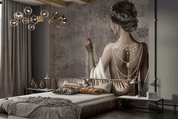 Fototapetai Moteris, matoma iš nugaros, su perlų vėriniais, pilkos spalvos akmens rašto fonas Nr. w04854