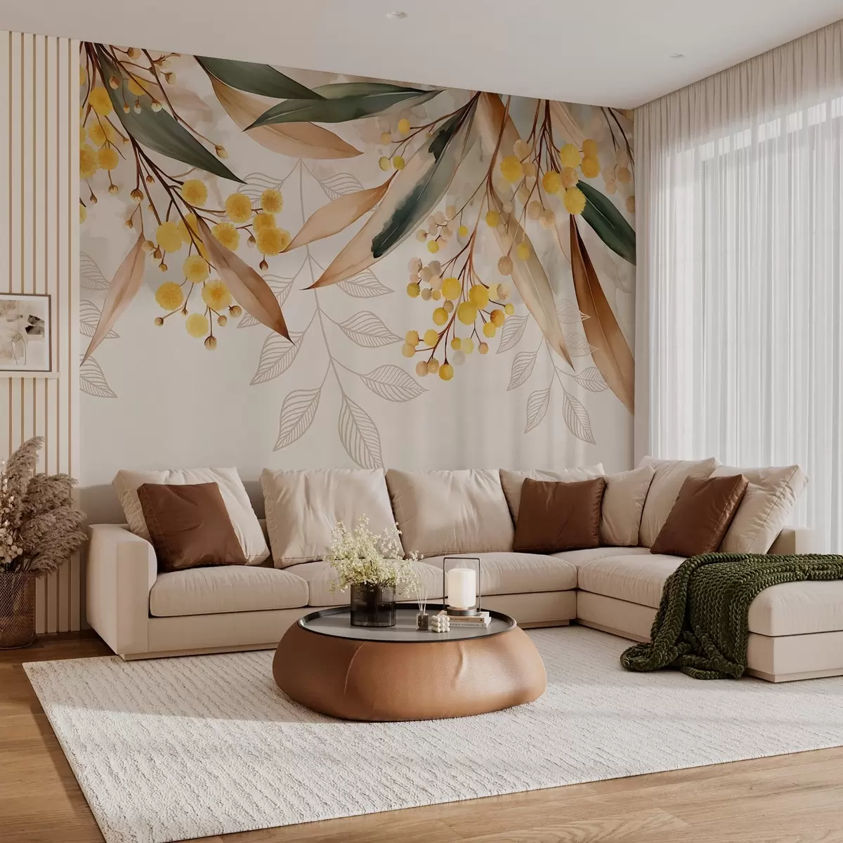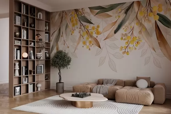 Fototapetai akvarelės stiliaus mimosa gėlės ir lapai, krentantys iš viršaus Nr. w04880