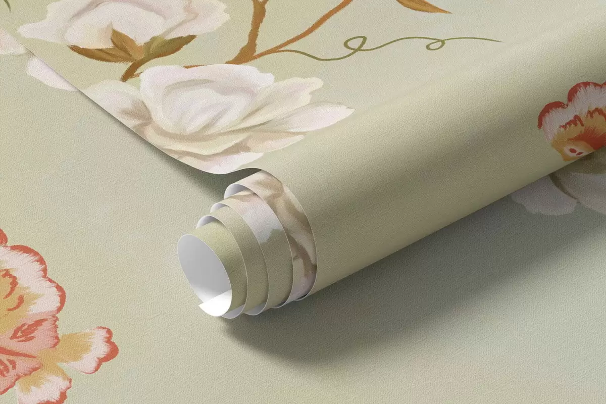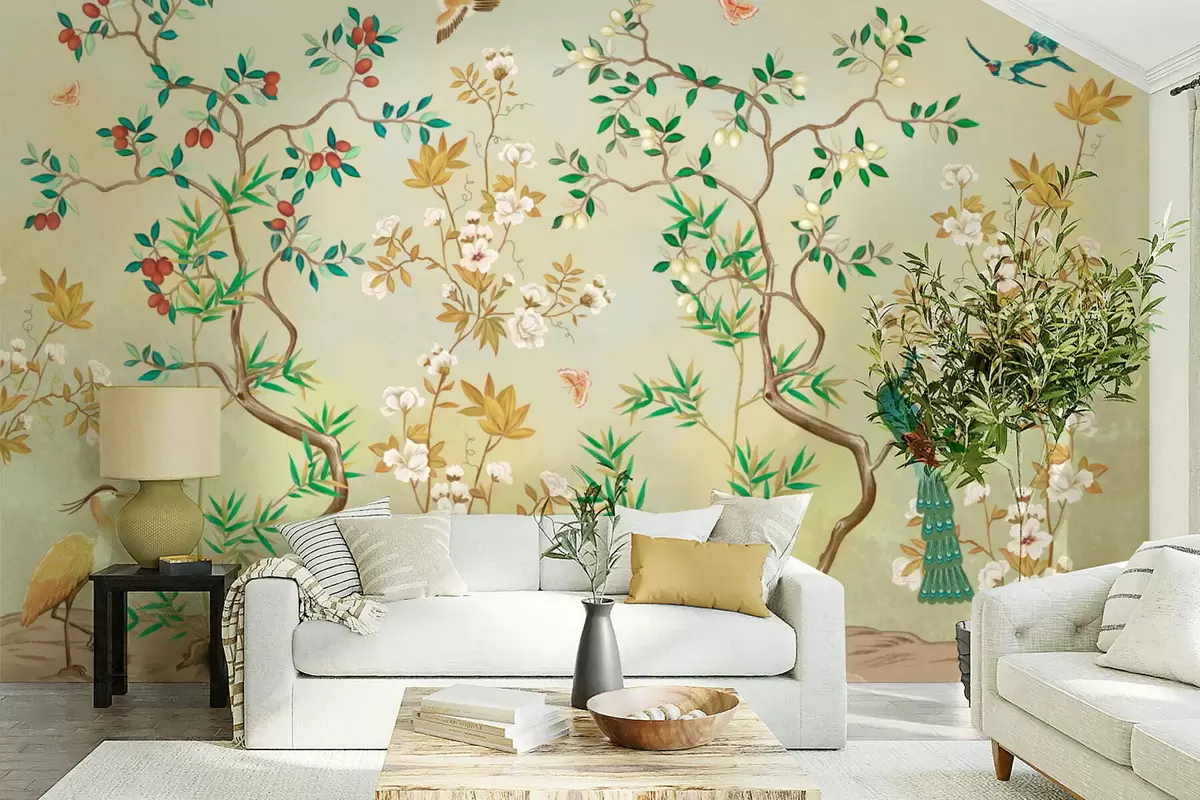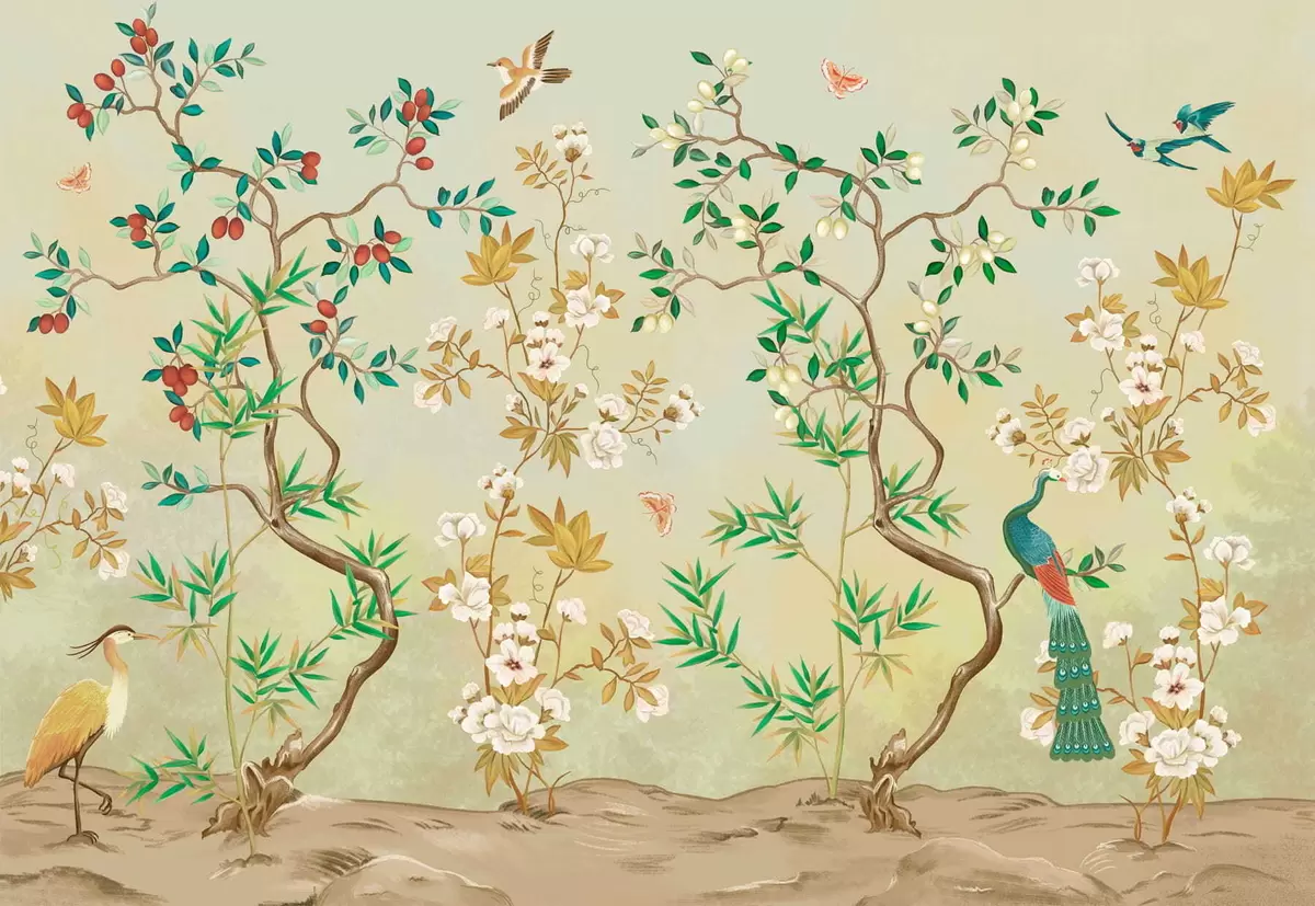 Fototapetai Scena su medžiais, gėlėmis ir paukščiais, šviesus fonas Nr. w05004v1