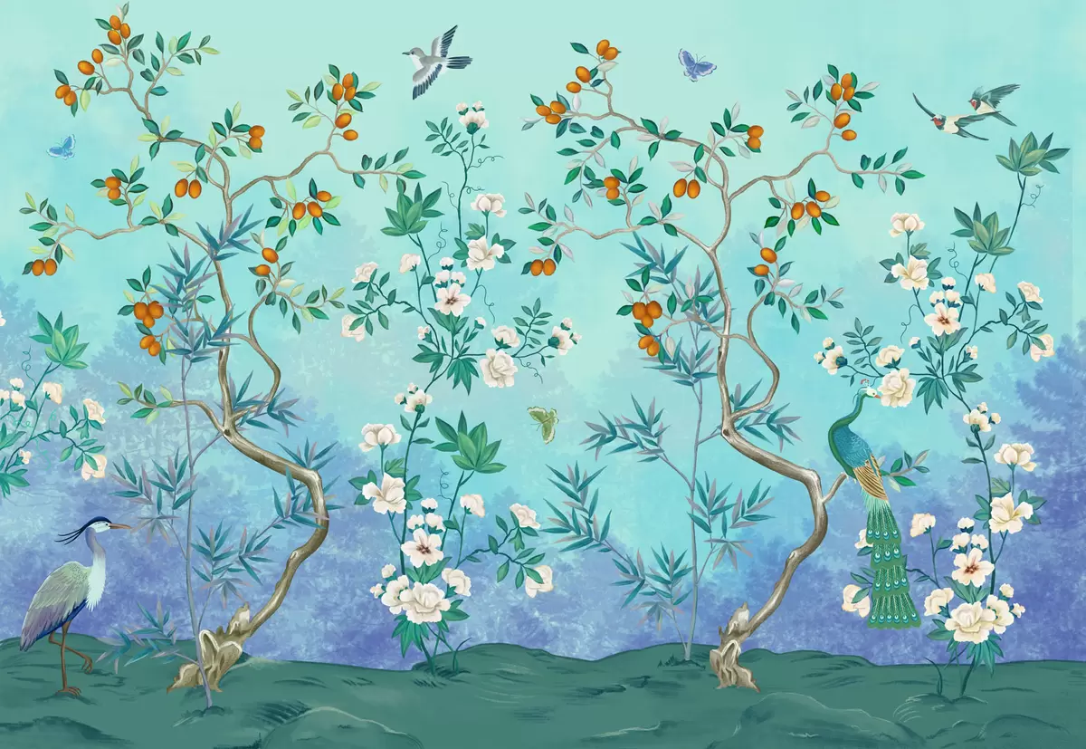 Fototapetai Scena su medžiais, gėlėmis ir paukščiais, mėlynas fonas Nr. w05004v2
