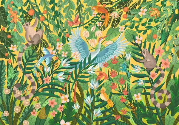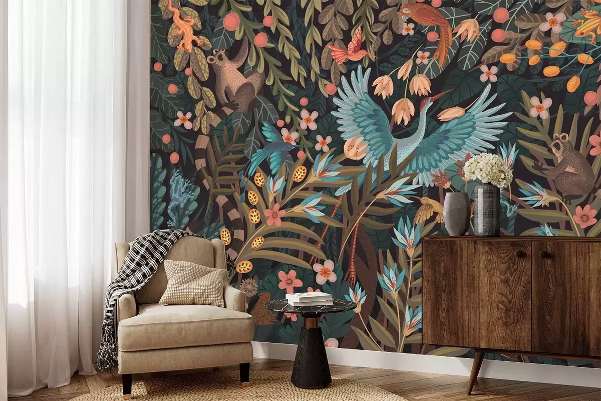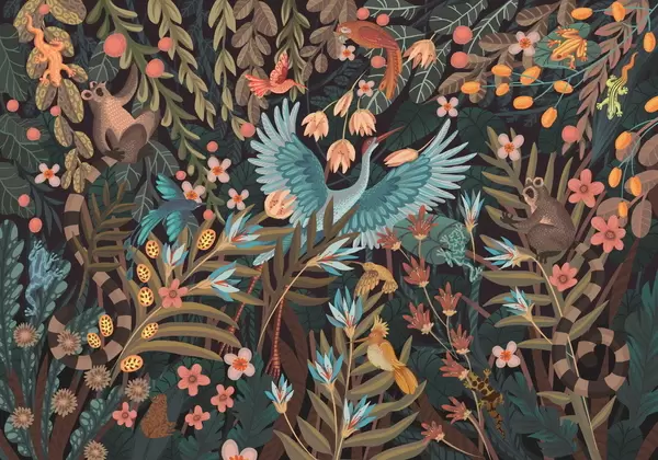 Fototapetai Fantazijos scena su paukščiais ir gyvūnais tarp augalų Nr. w05024