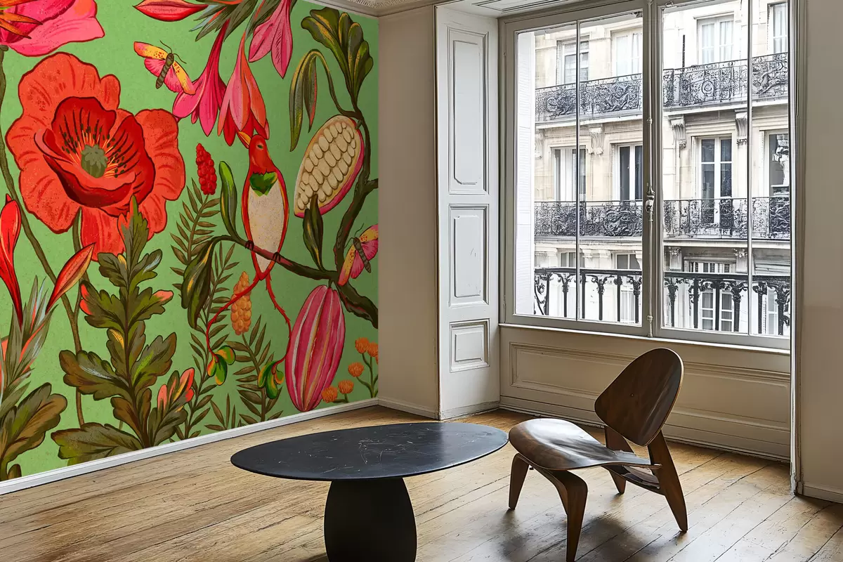 Fototapetai Dekoratyvinės gėlės ir paukščiai ant žalios fono Nr. w05036v1