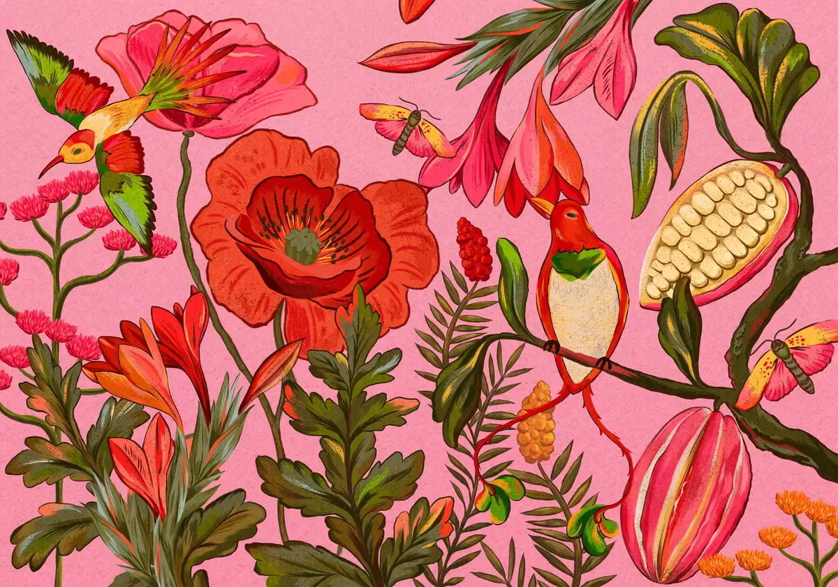 Fototapetai Dekoratyvinės gėlės ir paukščiai ant rožinio fono Nr. w05036v2