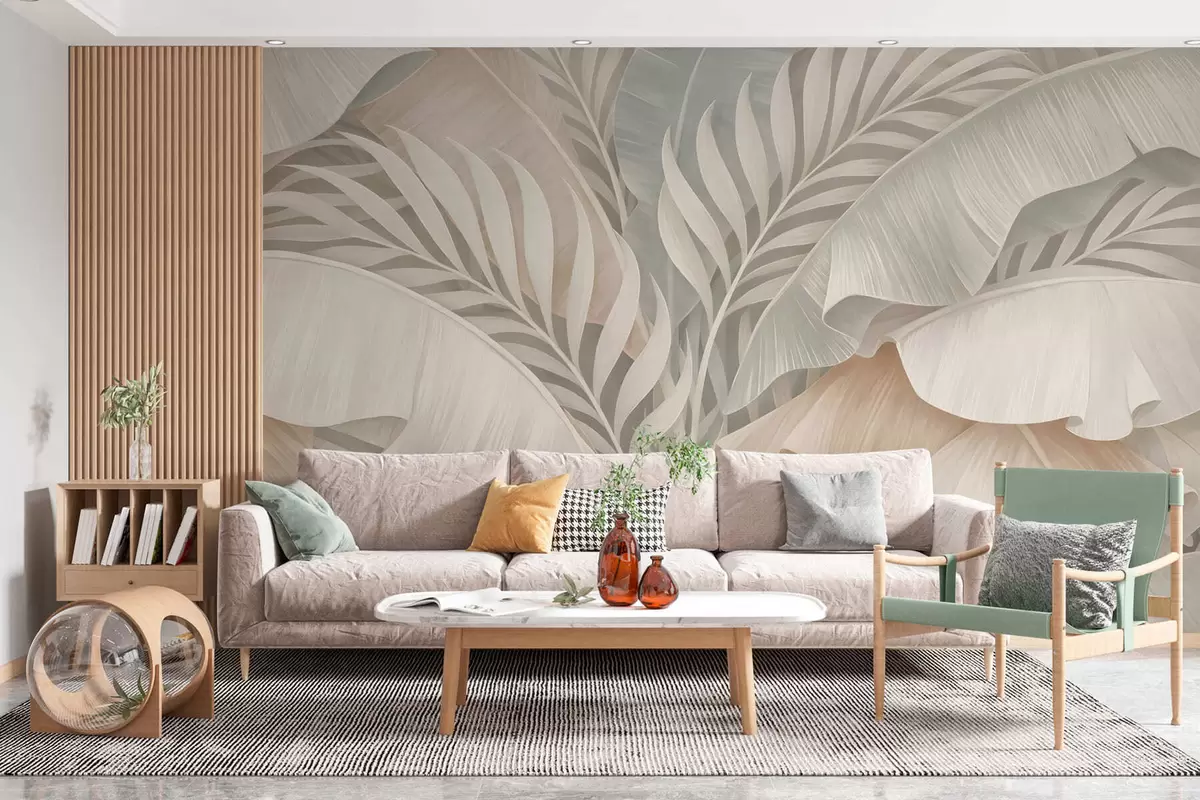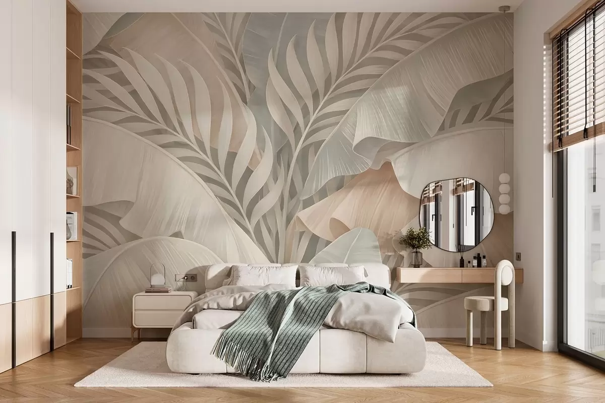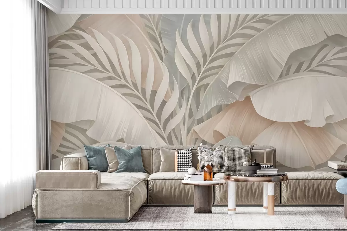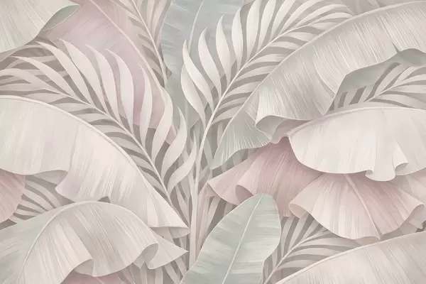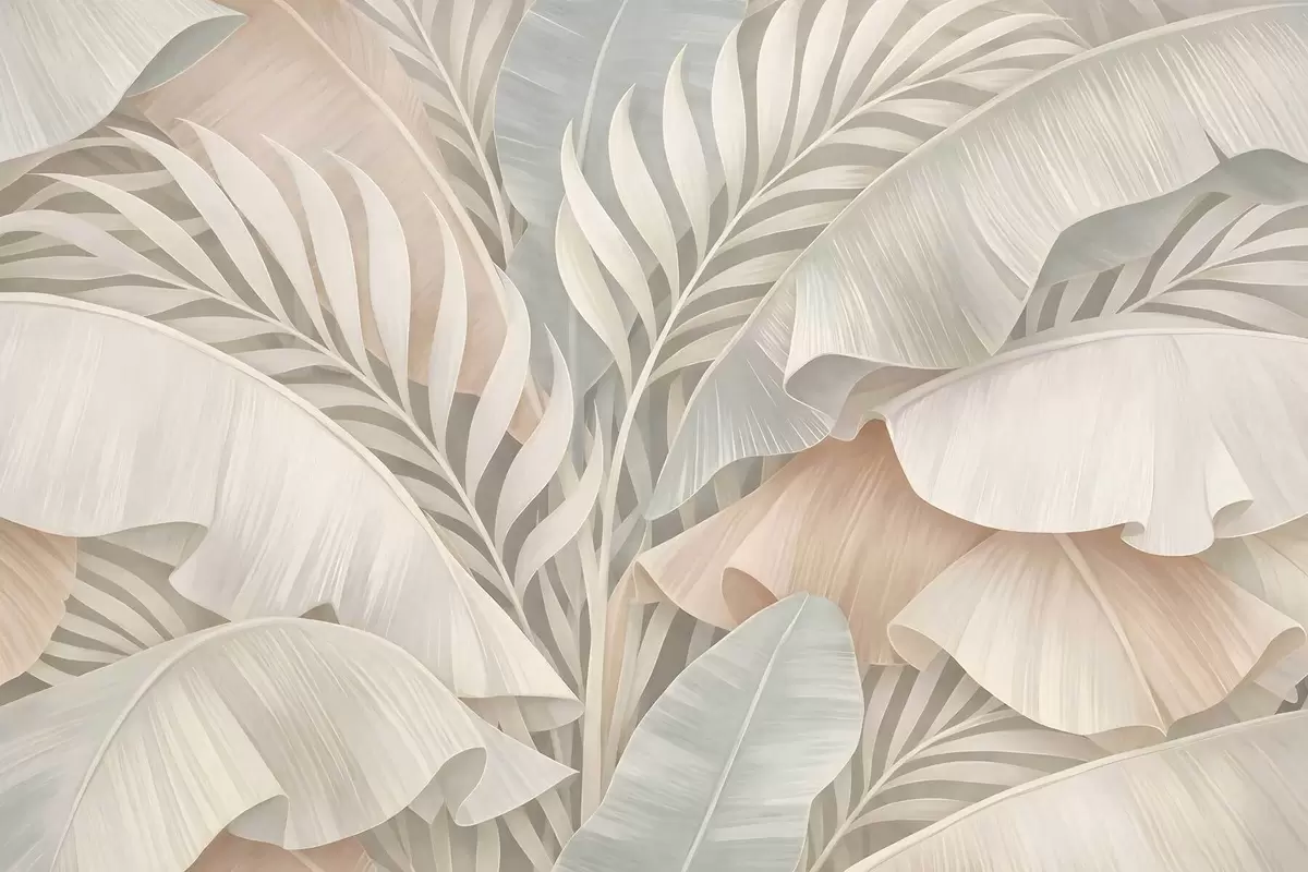 Fototapetai didelės tropinės lapai persikų ir blankios turkio spalvos atspalviais Nr. w05062