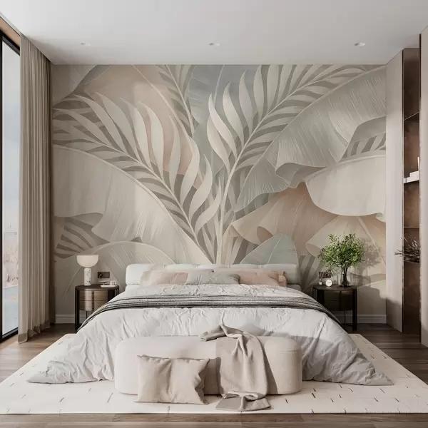 Fototapetai didelės tropinės lapai persikų ir blankios turkio spalvos atspalviais Nr. w05062