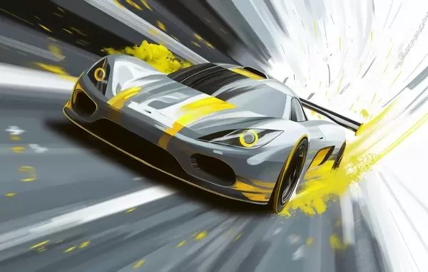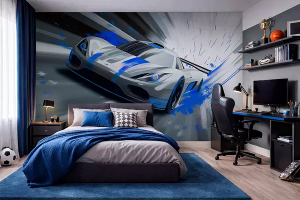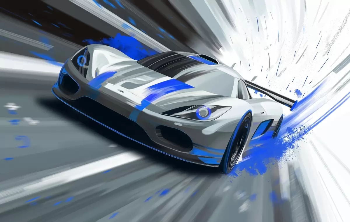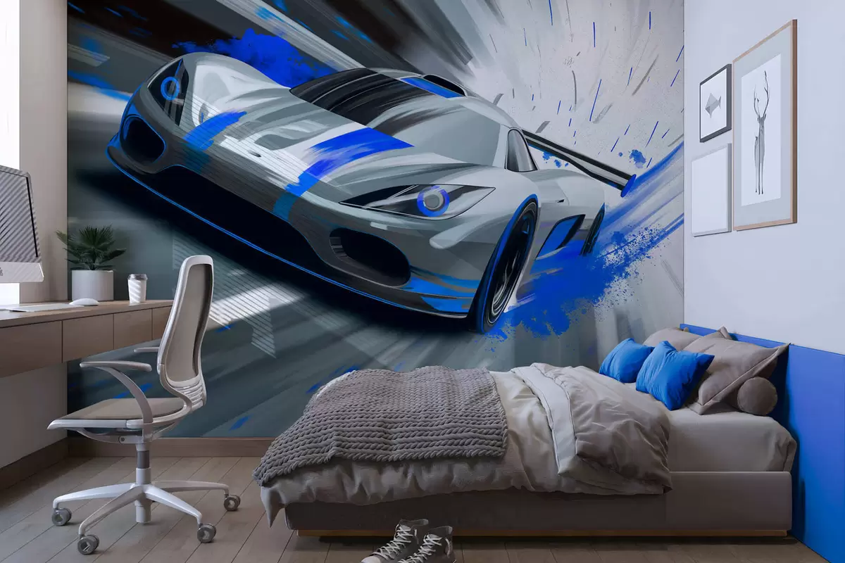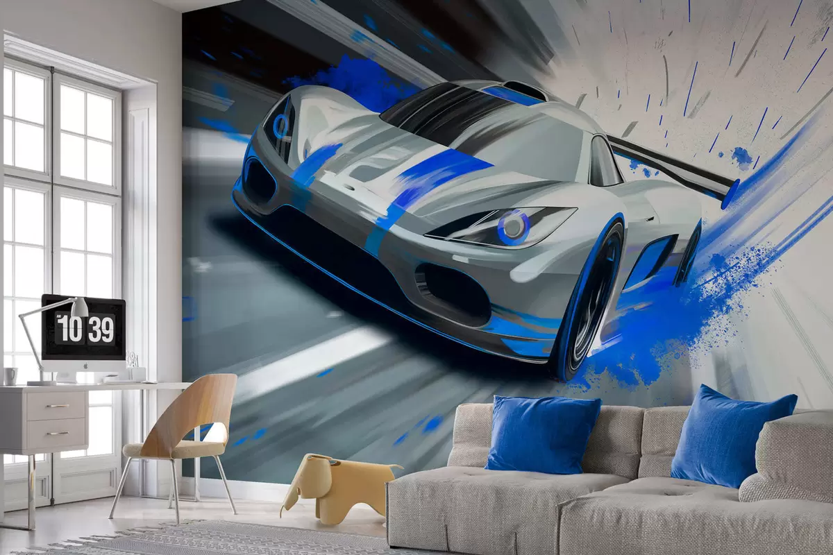 Fototapetai dinamiškas sportinis automobilis, nupieštas skaitmeniniu stiliumi su mėlynais akcentais Nr. w05069