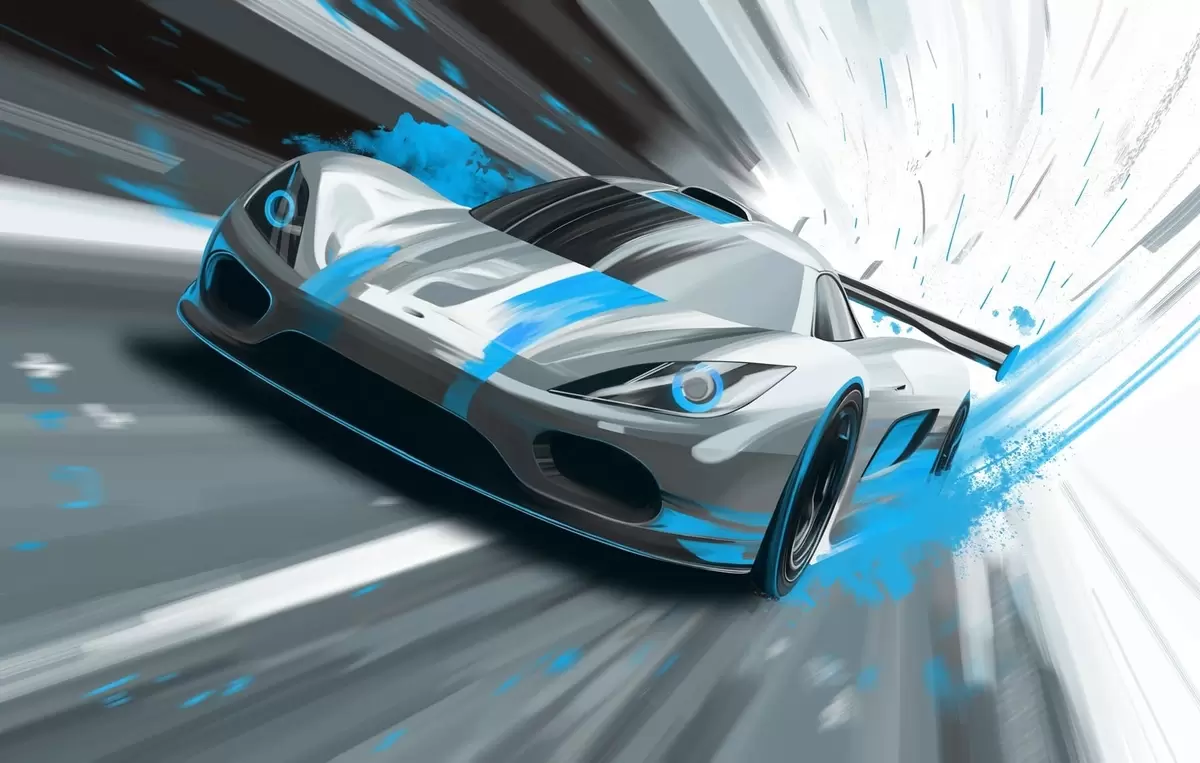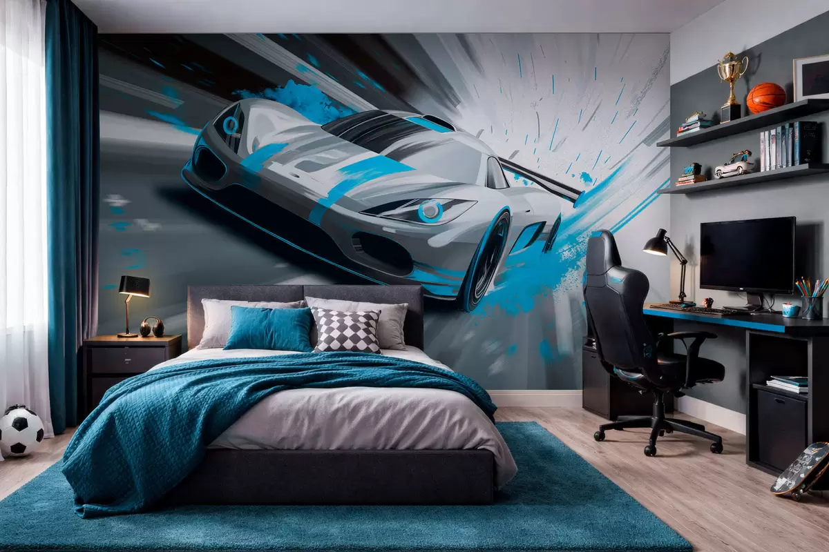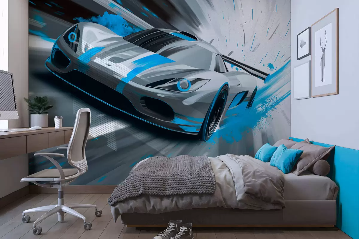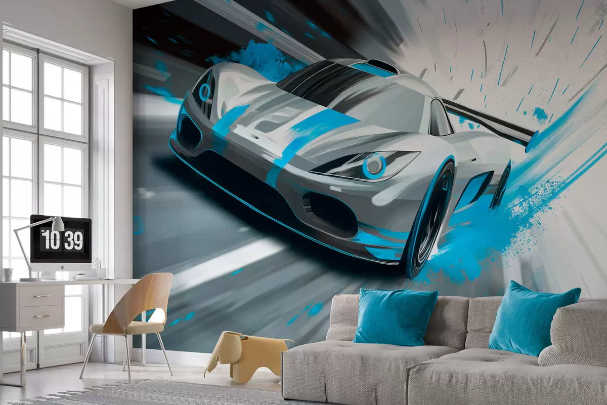 Fototapetai dinamiškas sportinis automobilis, nupieštas skaitmeniniu stiliumi su turkio akcentais Nr. w05069v3