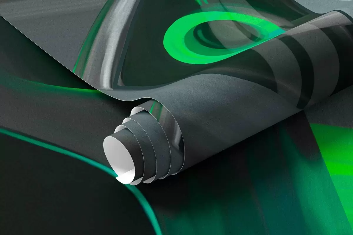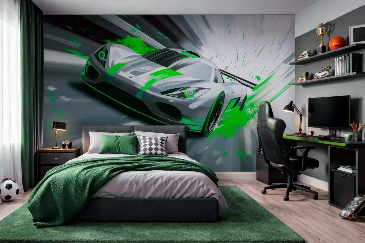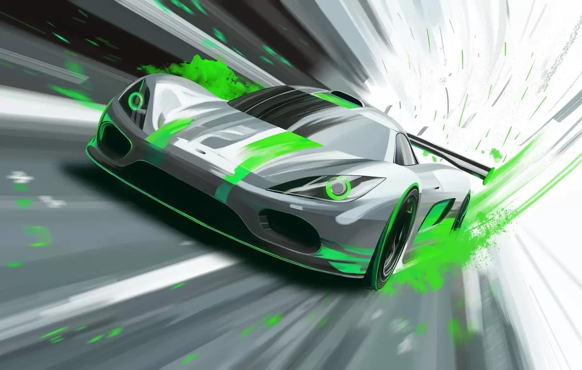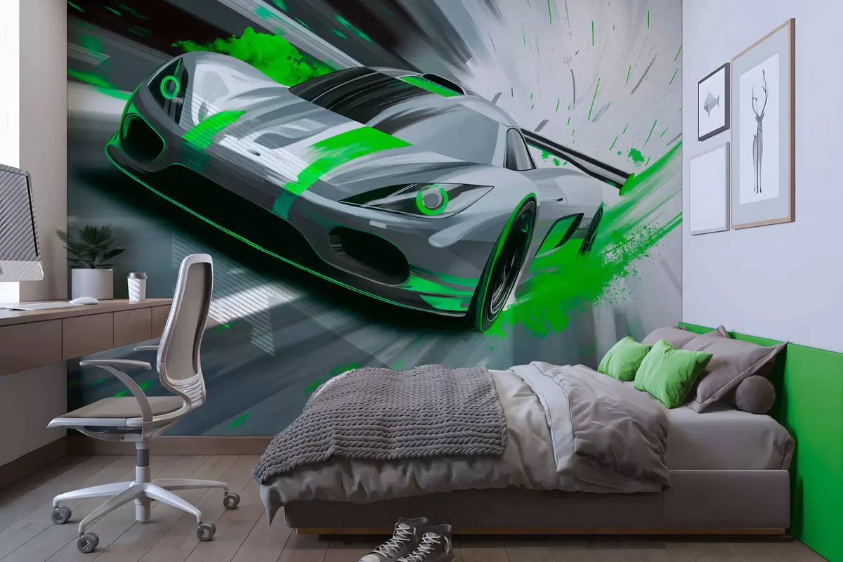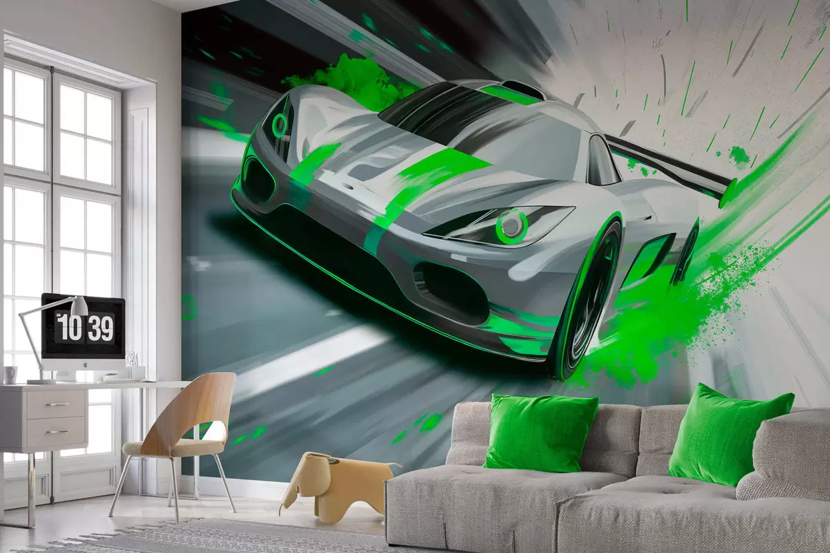 Fototapetai dinamiškas sportinis automobilis, nupieštas skaitmeniniu stiliumi su žaliais akcentais Nr. w05069v4