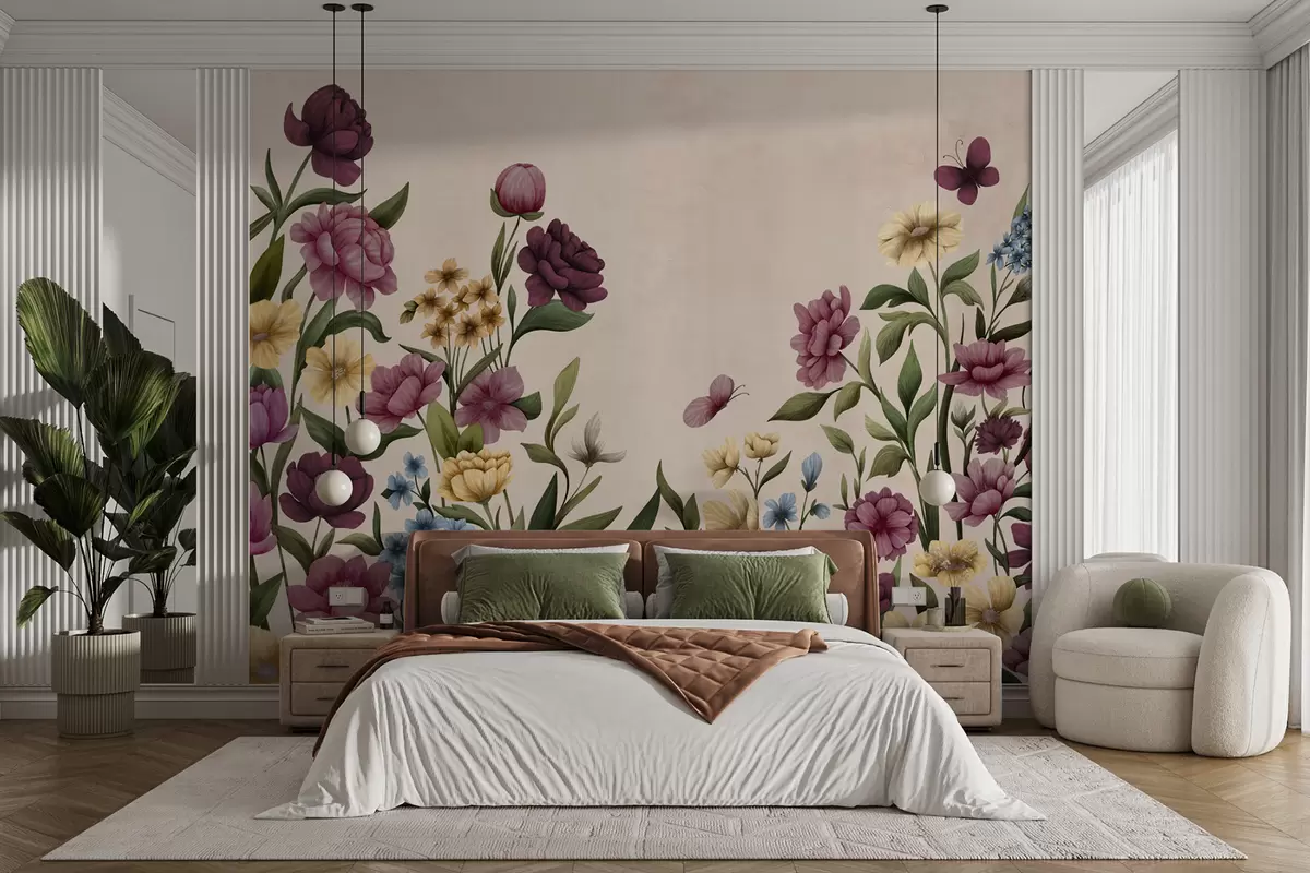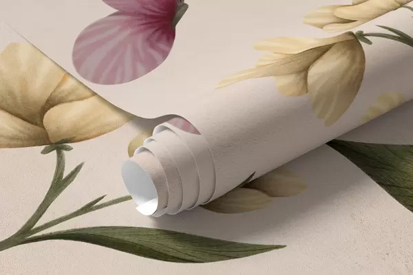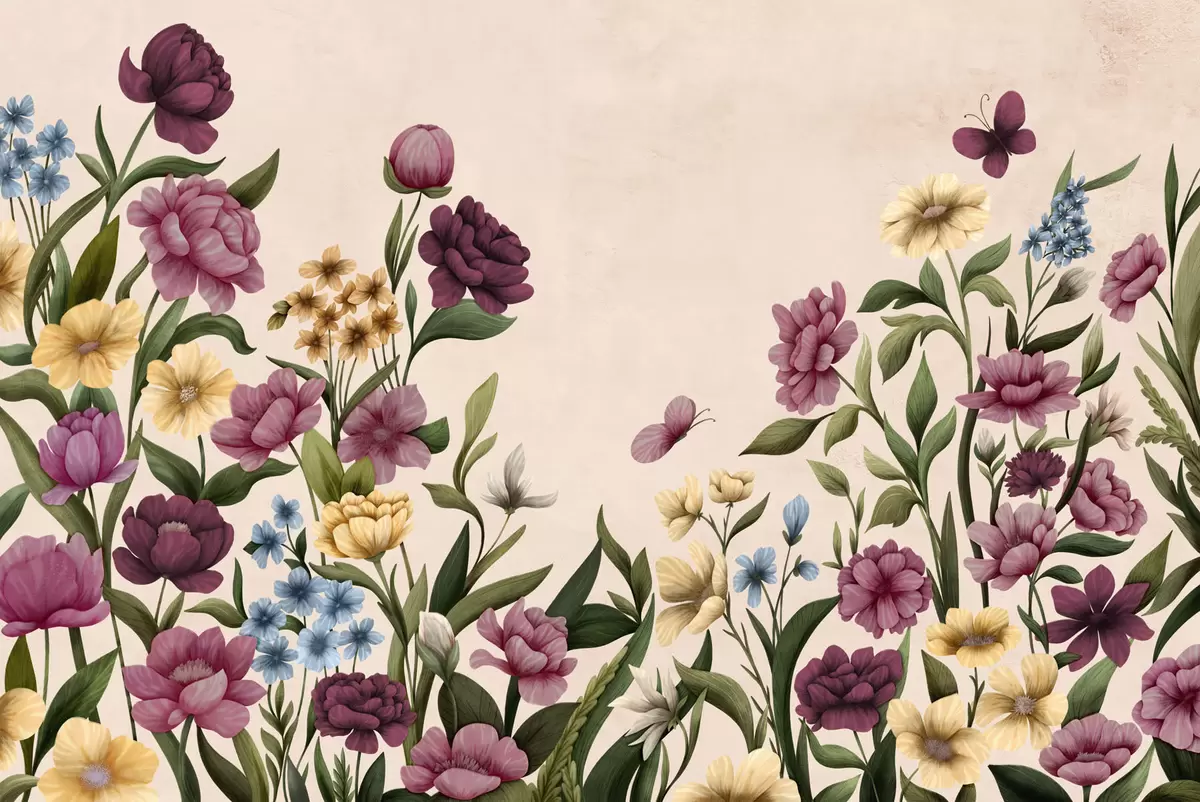 Fototapetai Gėlių kompozicija su augalais ir drugeliais šviesiu fonu Nr. w05072