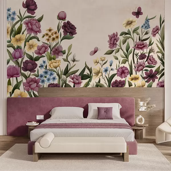 Fototapetai Gėlių kompozicija su augalais ir drugeliais šviesiu fonu Nr. w05072