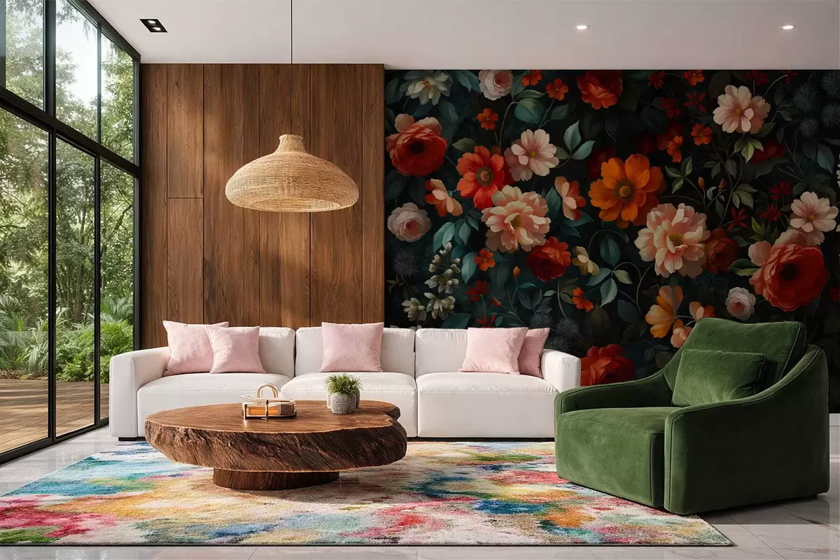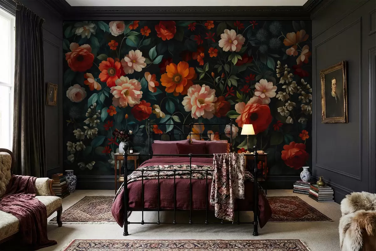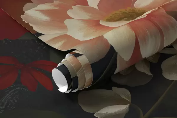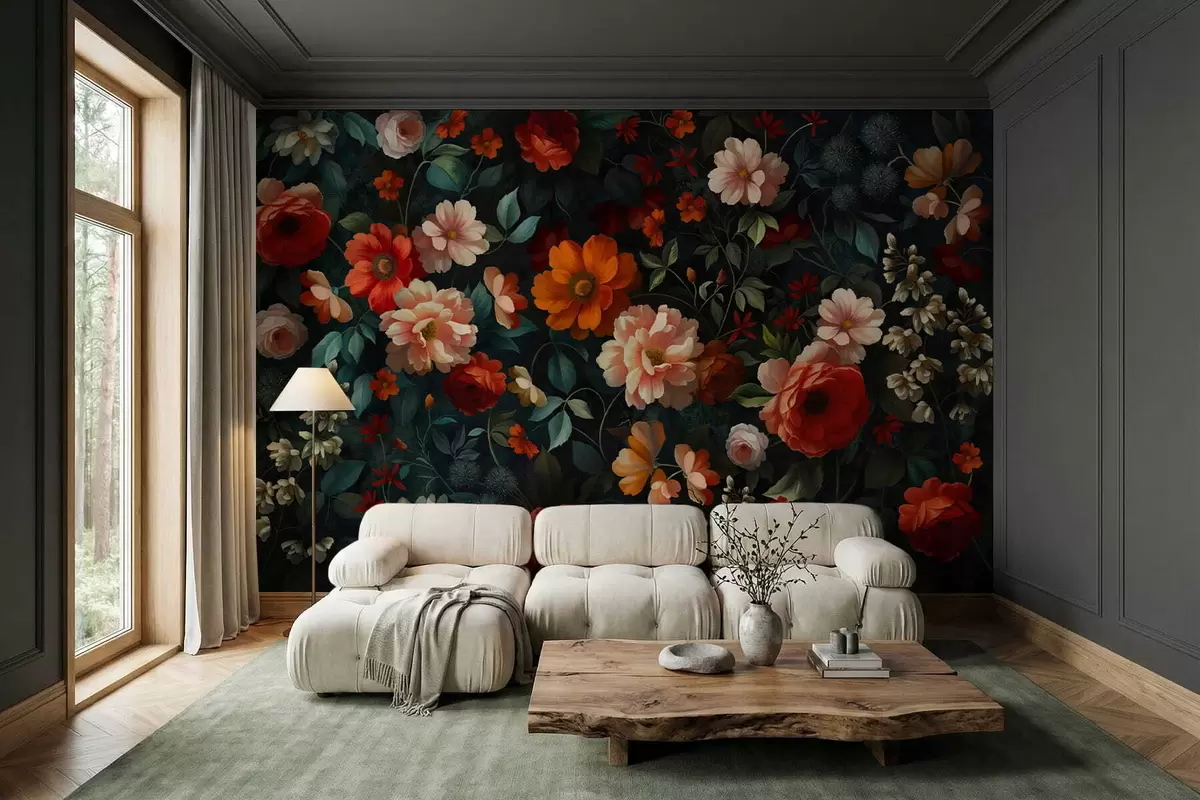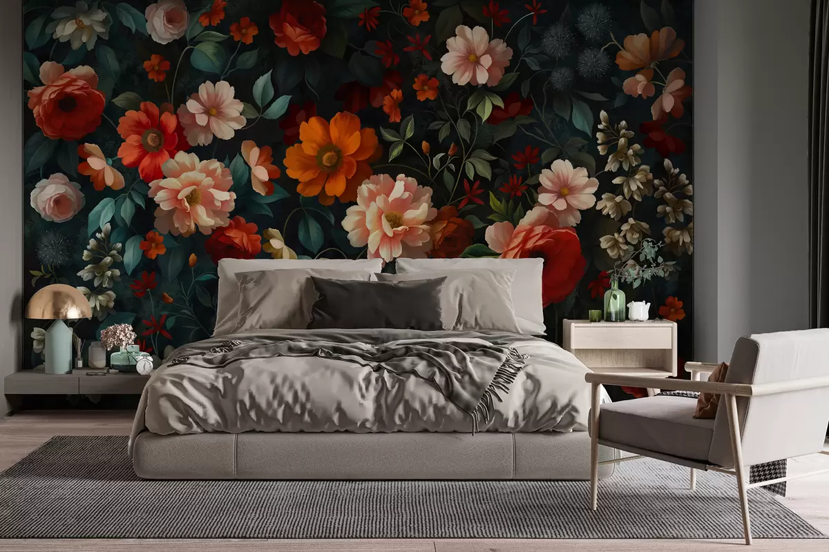 Fototapetai Tamsus gėlių raštas su sodriais sodo gėlėmis Nr. w05087