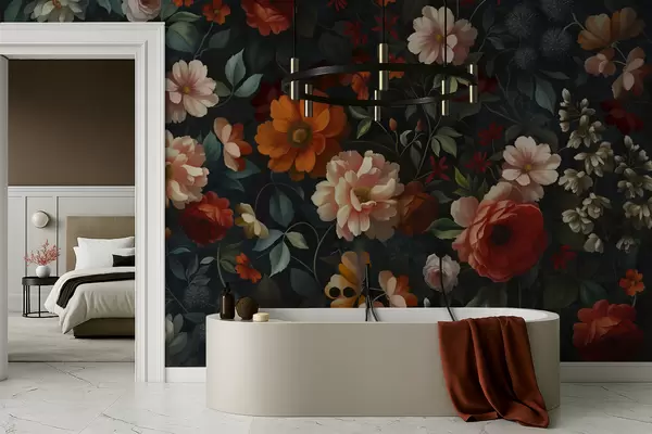 Fototapetai Tamsus gėlių raštas su sodriais sodo gėlėmis Nr. w05087