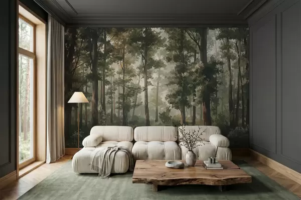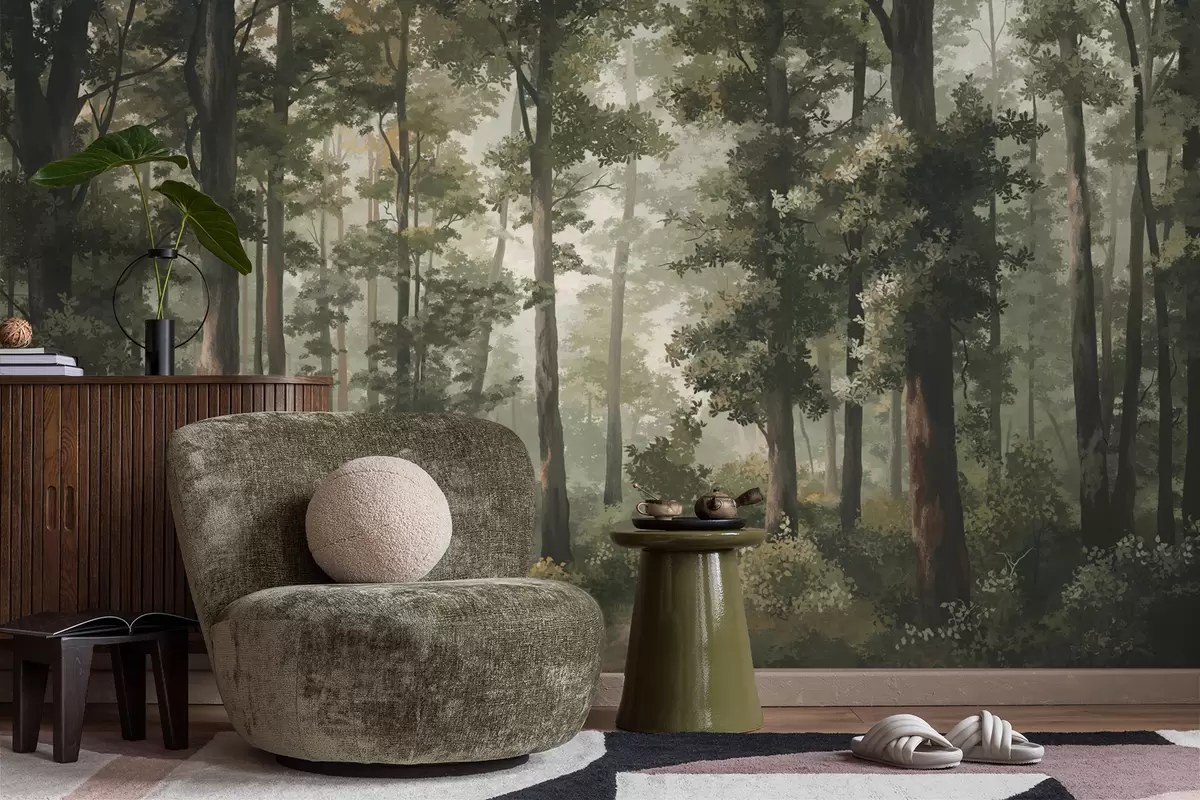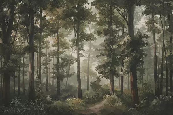 Fototapetai Miško iliustracija su rūku, aukštais medžiais ir taku Nr. w05089