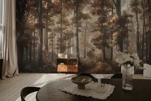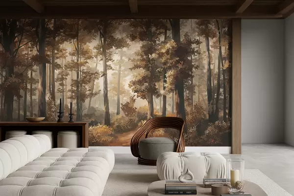 Fototapetai Rudens miško vaizdas su šilta šviesa ir tankiais medžiais Nr. w05089v1